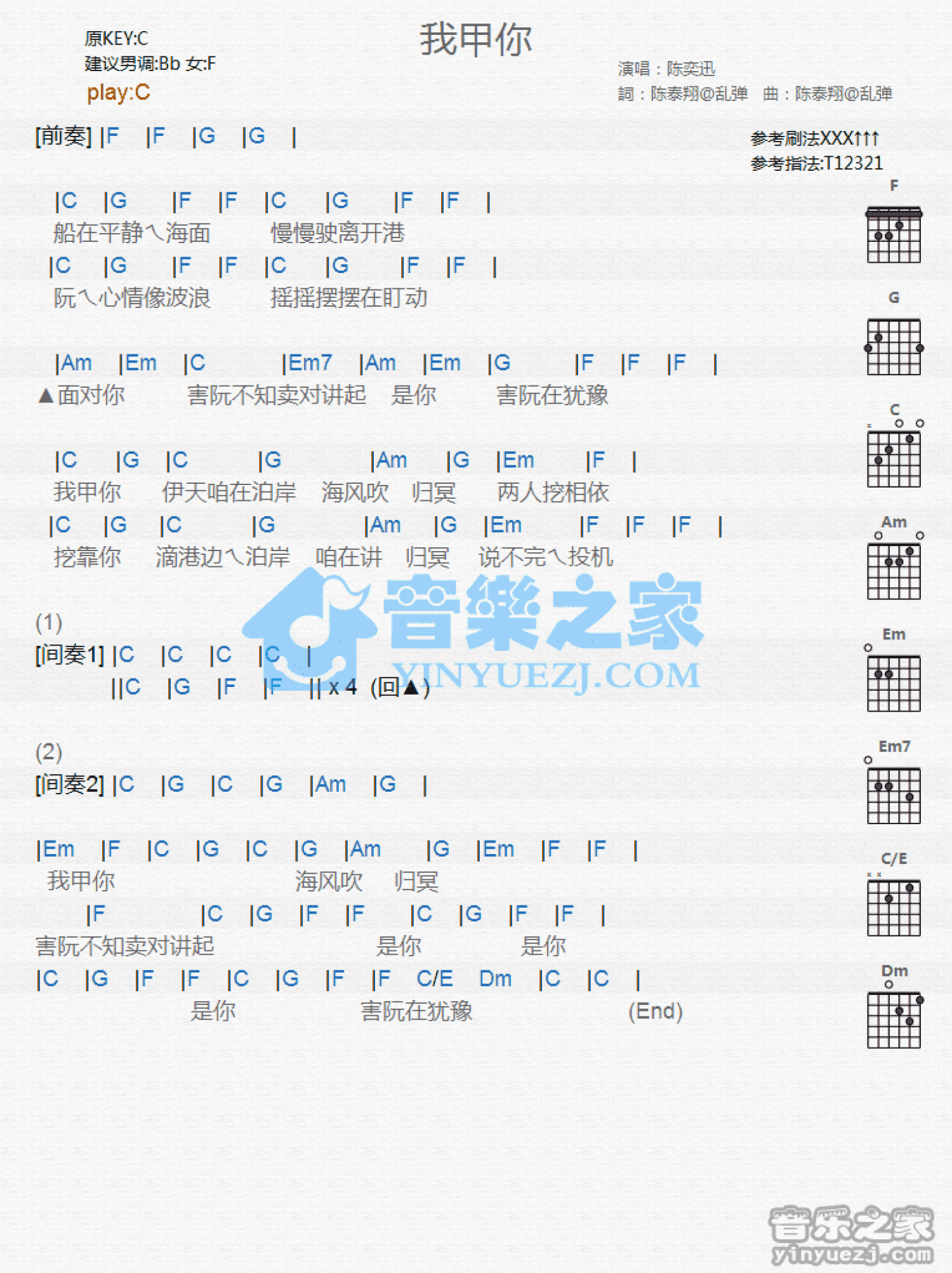 曲谱介绍: C调版陈奕迅《我甲你》吉他和弦弹唱谱