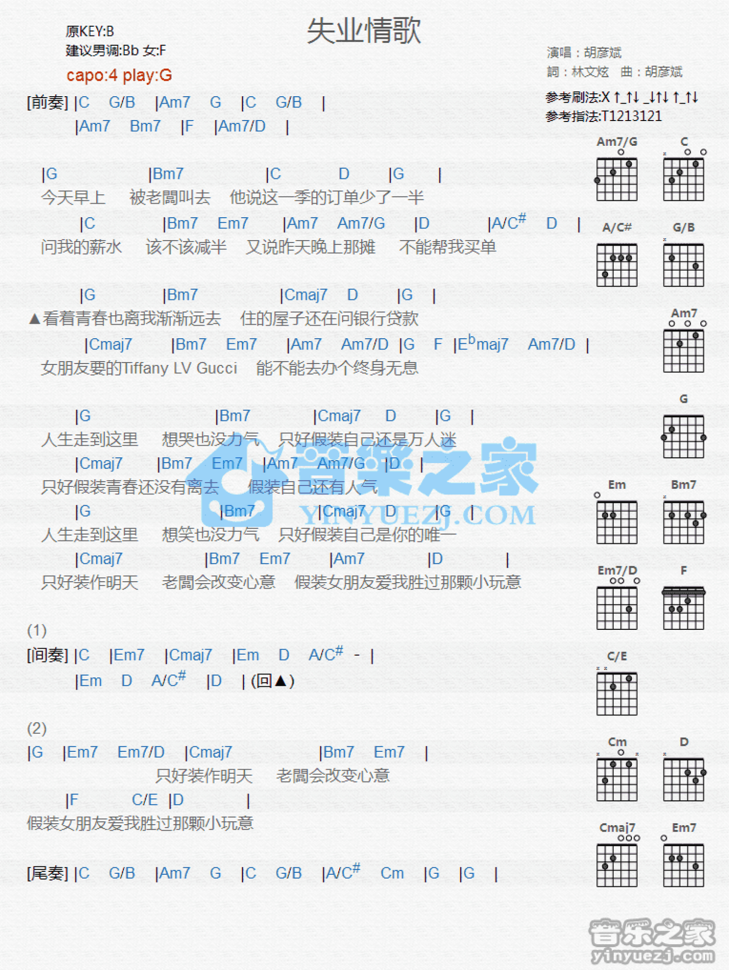 曲谱介绍: G调版胡彦斌《失业情歌》吉他和弦弹唱谱