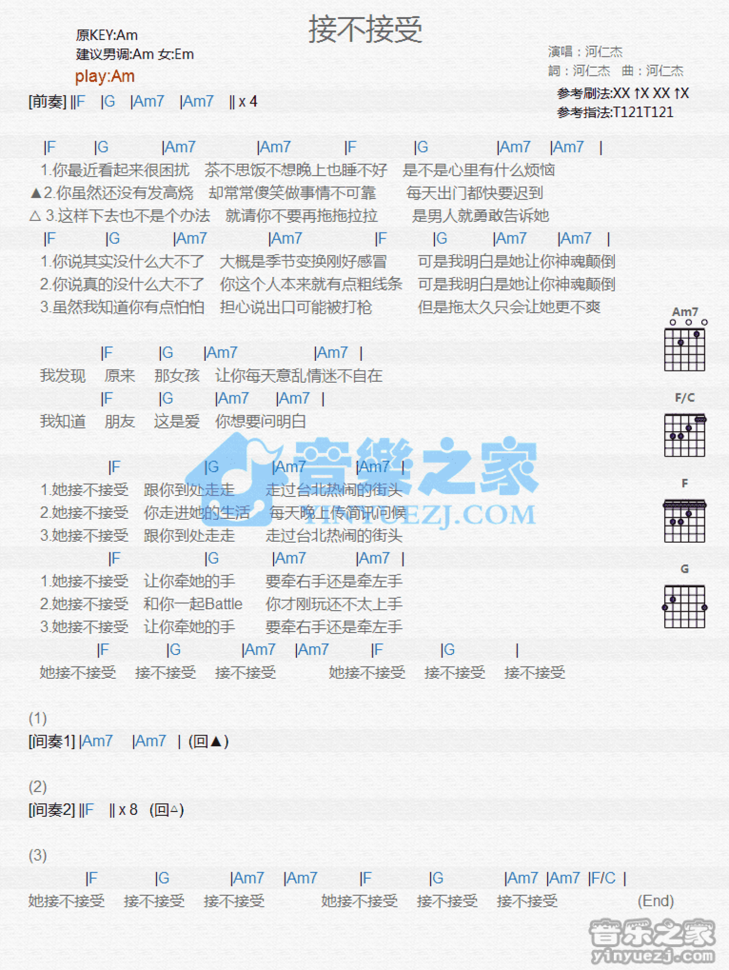 曲谱介绍: Am调版河仁杰《接不接受》吉他和弦弹唱谱