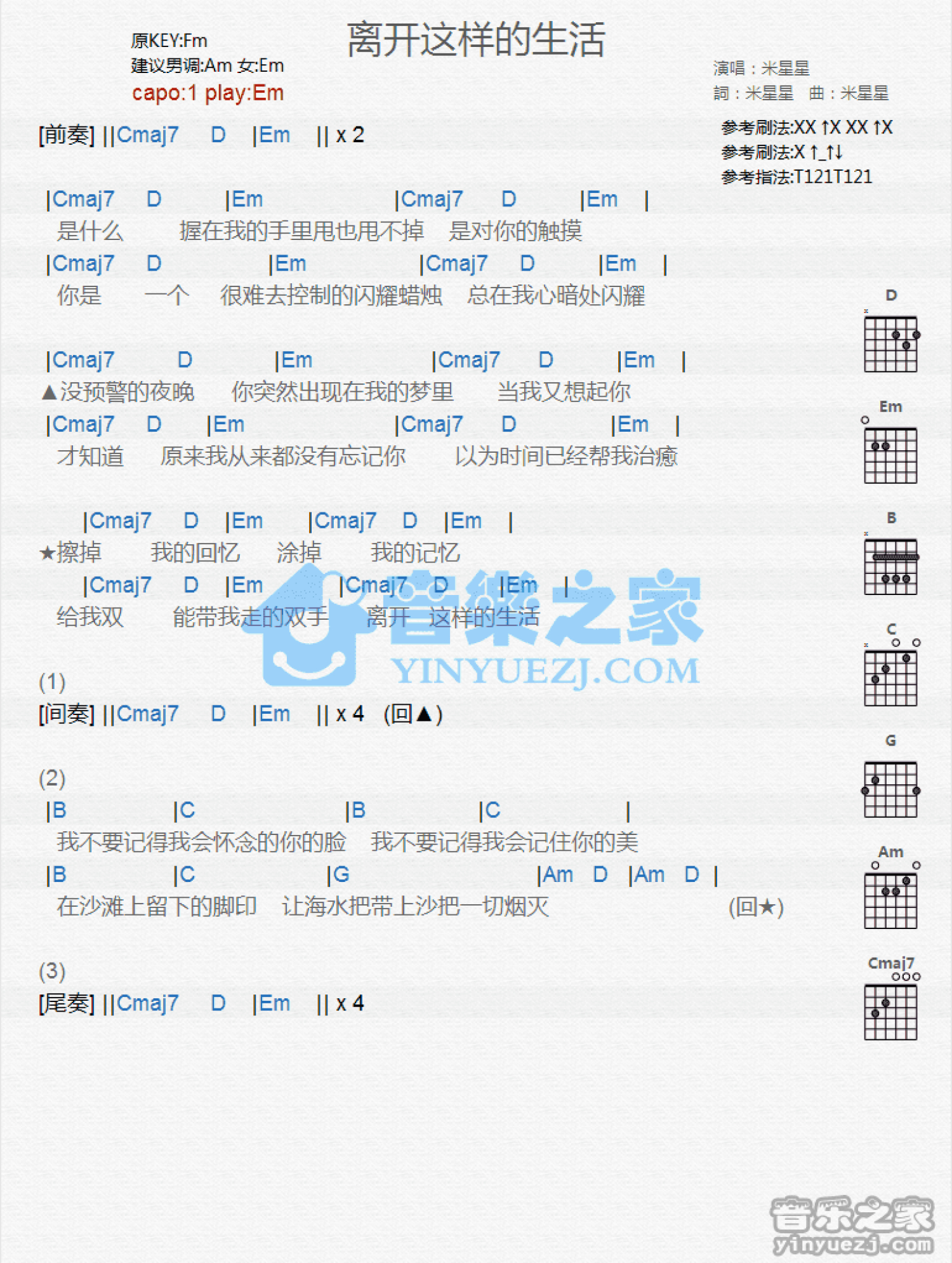 曲谱介绍: Em调版米星星《离开这样的生活》吉他和弦弹唱谱