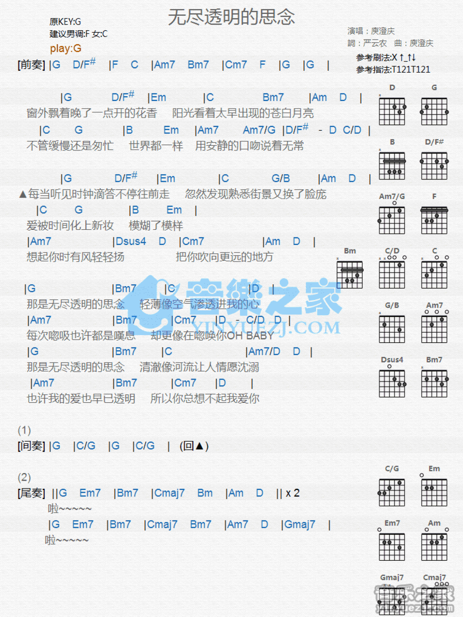 曲谱介绍: G调版《无尽透明的思念》吉他和弦弹唱谱