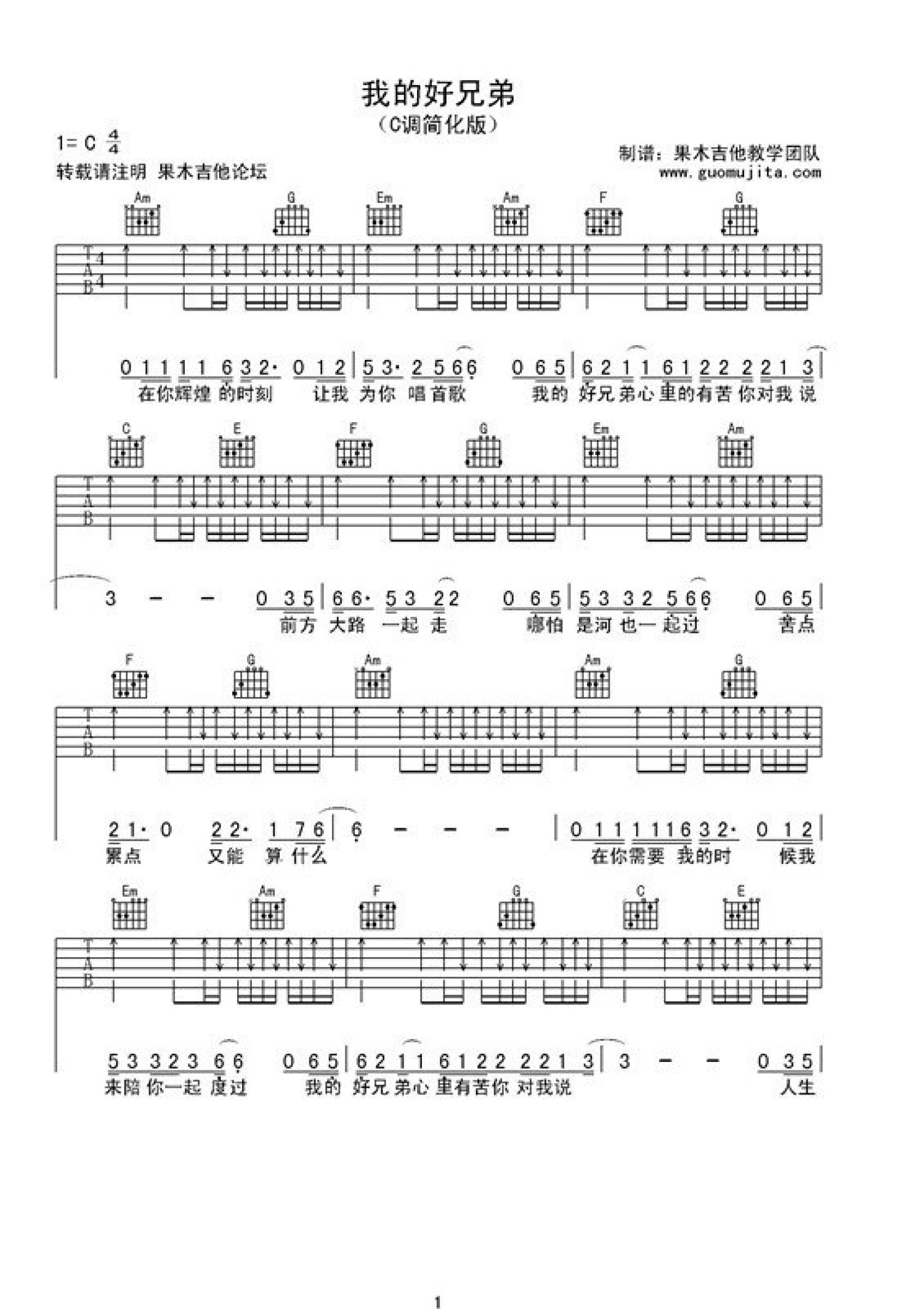 曲谱介绍: 果木浪子C调版 小沈阳《我的好兄弟》吉他弹唱六线谱