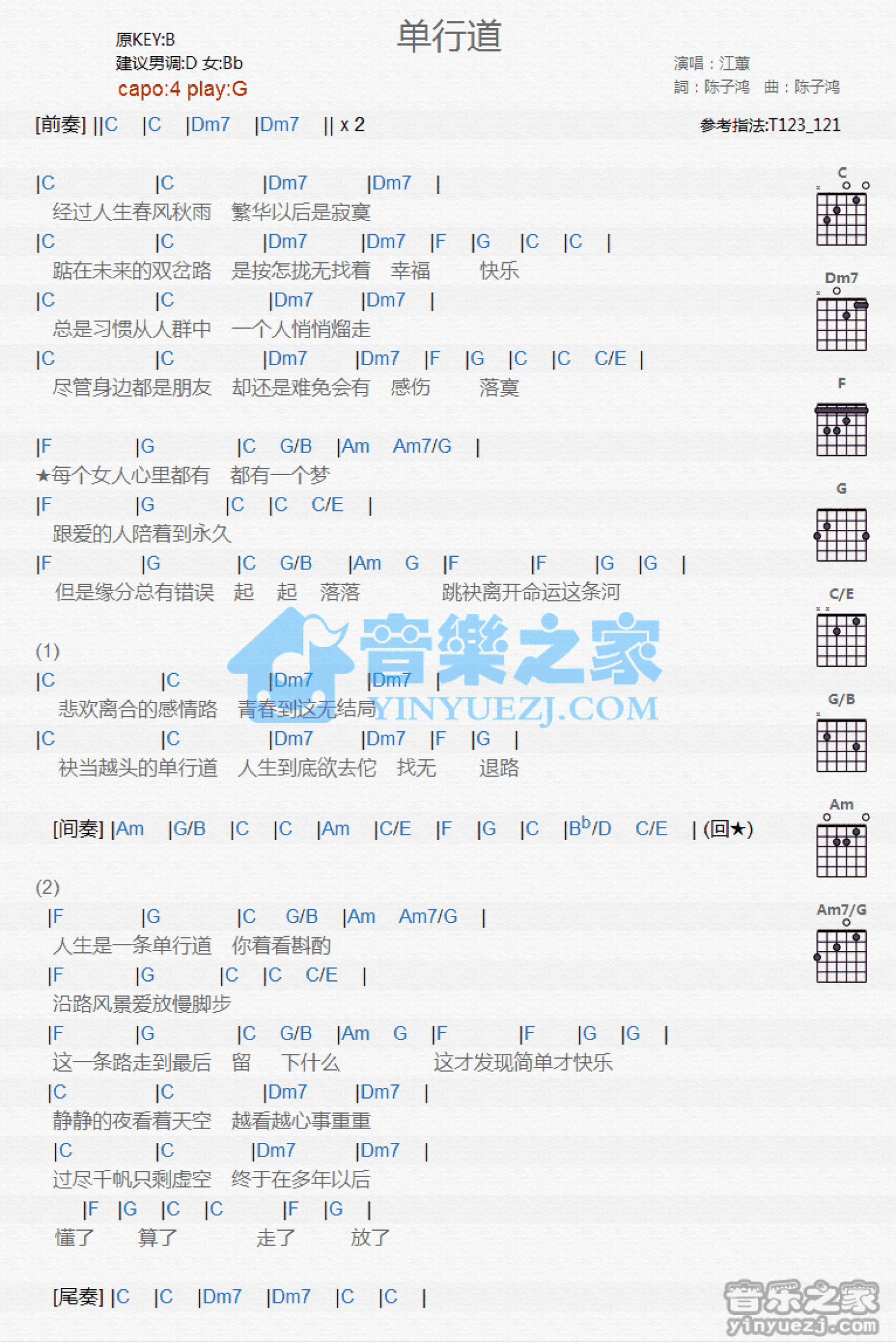 曲谱介绍: G调版江蕙《单行道》吉他和弦弹唱谱