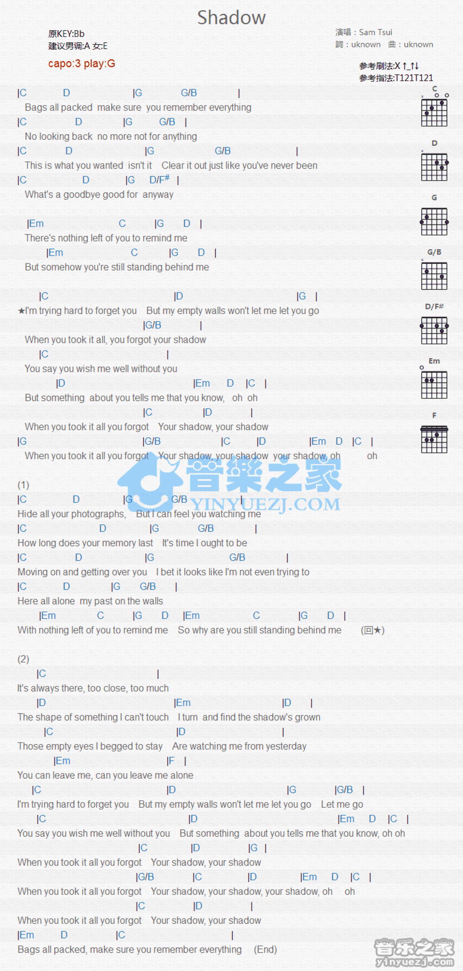 曲谱介绍: G调版SamTsui《Shadow》吉他和弦弹唱谱