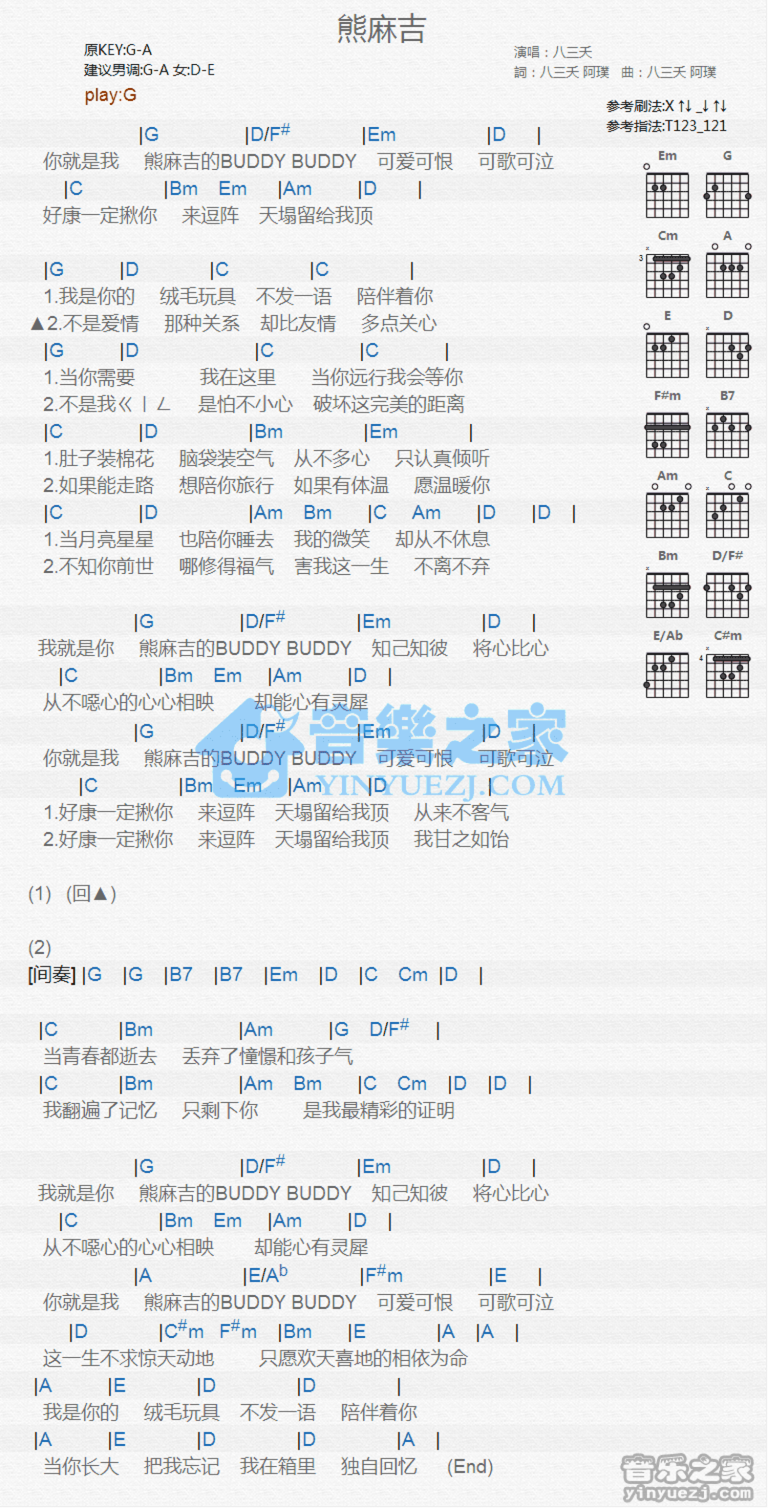 曲谱介绍: G调版八三夭《熊麻吉》吉他和弦弹唱谱