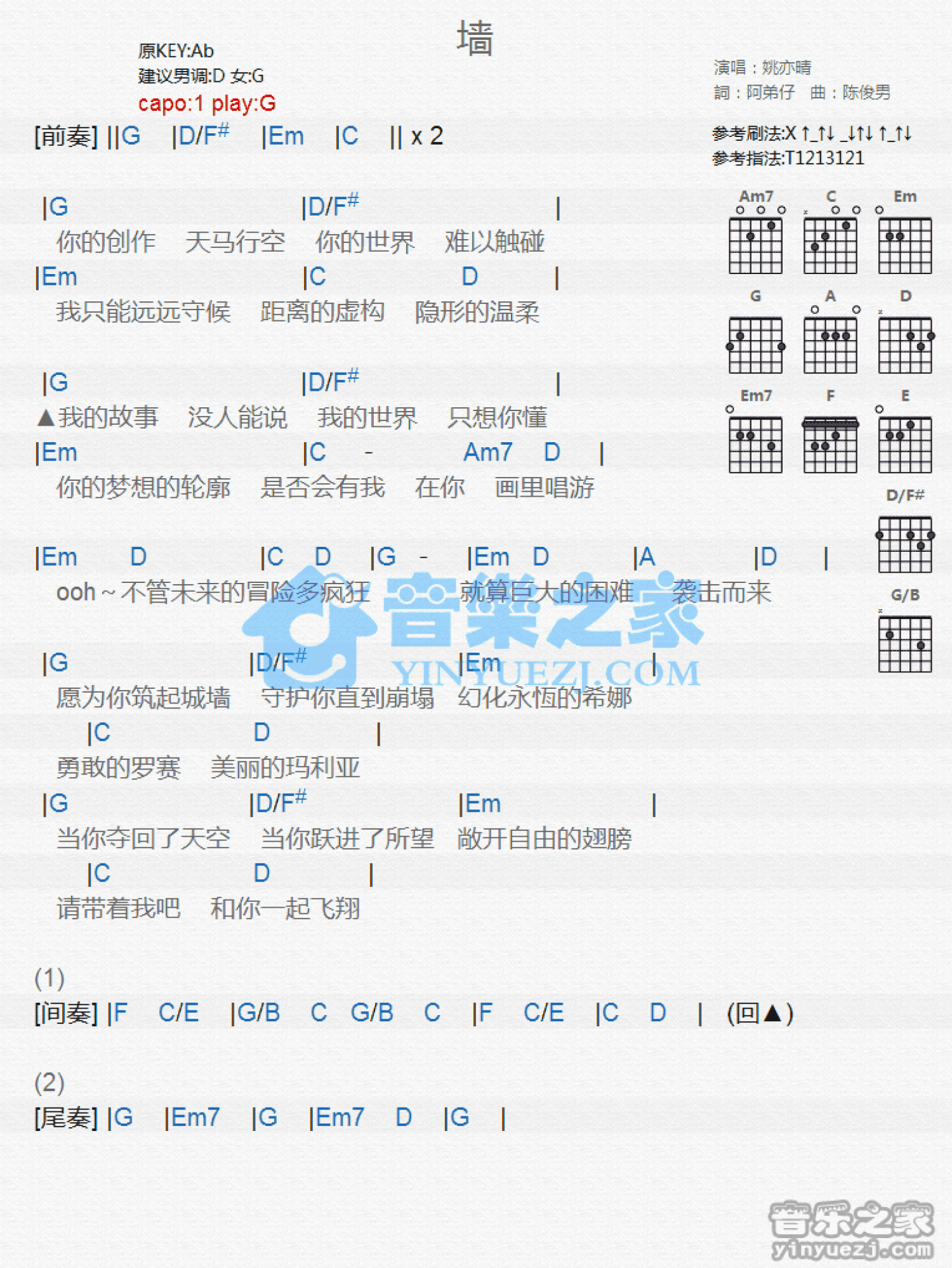 墙吉他谱 - 姚亦晴 - G调吉他弹唱谱 - 和弦谱