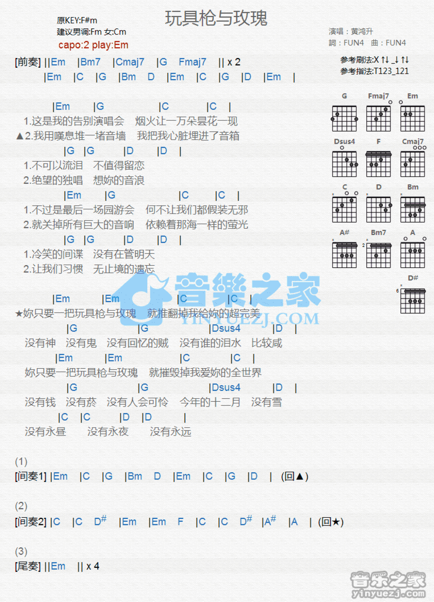 曲谱介绍: Em调版黄鸿升《玩具枪与玫瑰》吉他和弦弹唱谱