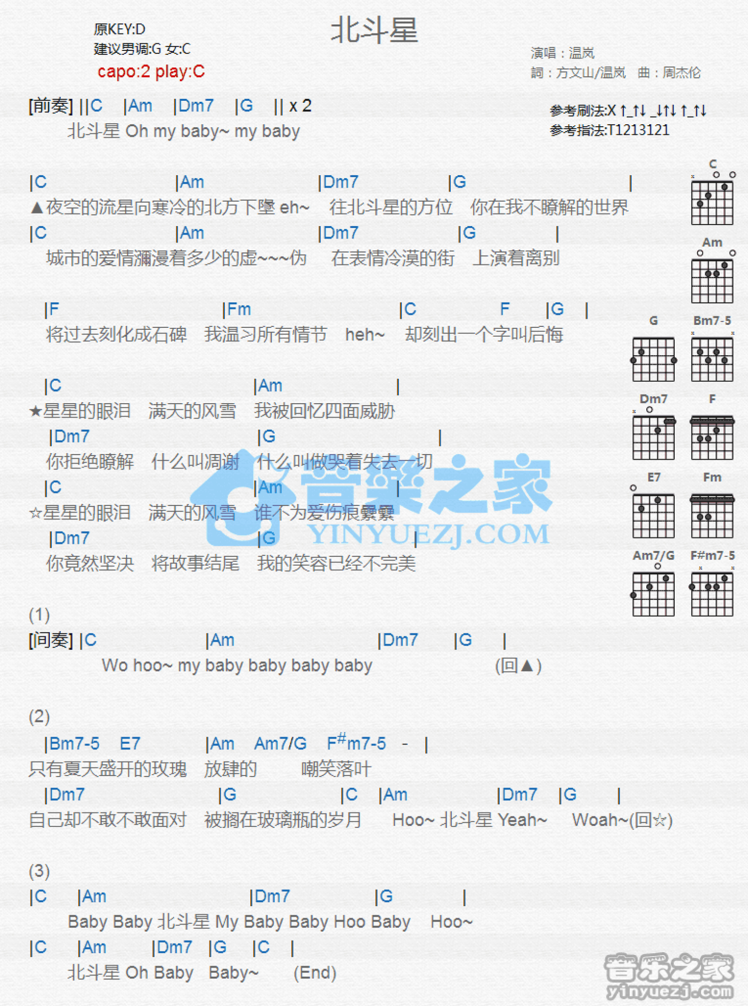 曲谱介绍: C调版温岚《北斗星》吉他和弦弹唱谱