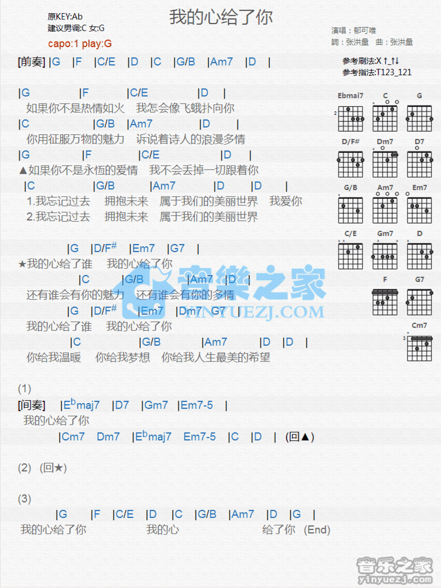 曲谱介绍: G调版郁可唯《我的心给了你》吉他和弦弹唱谱