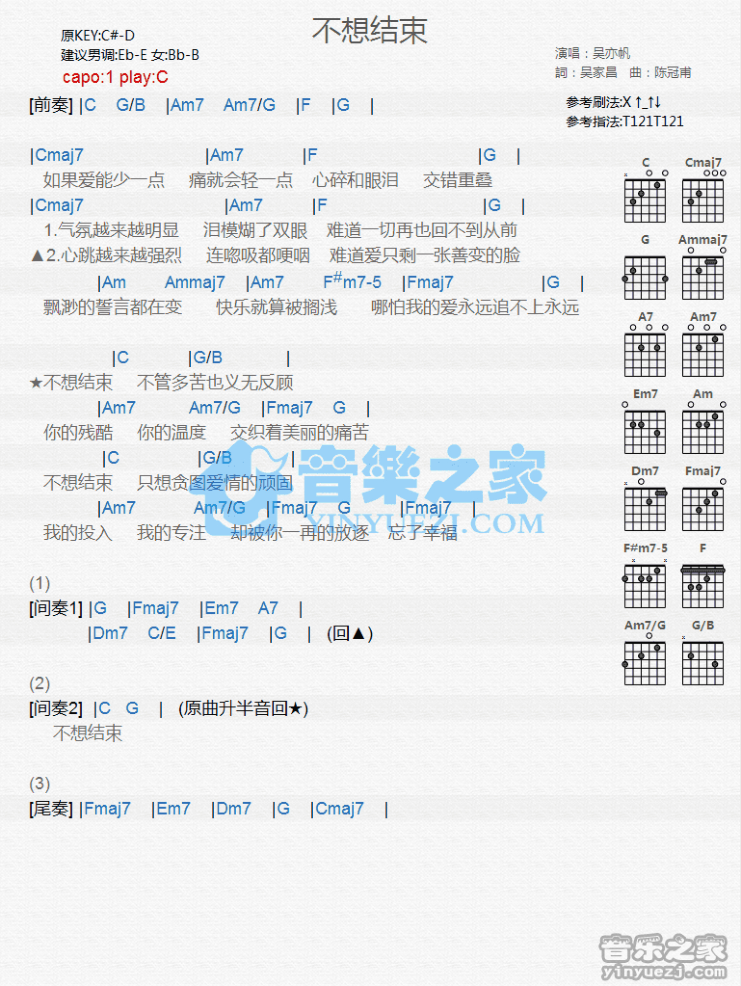 曲谱介绍: C调版吴亦帆《不想结束》吉他和弦弹唱谱