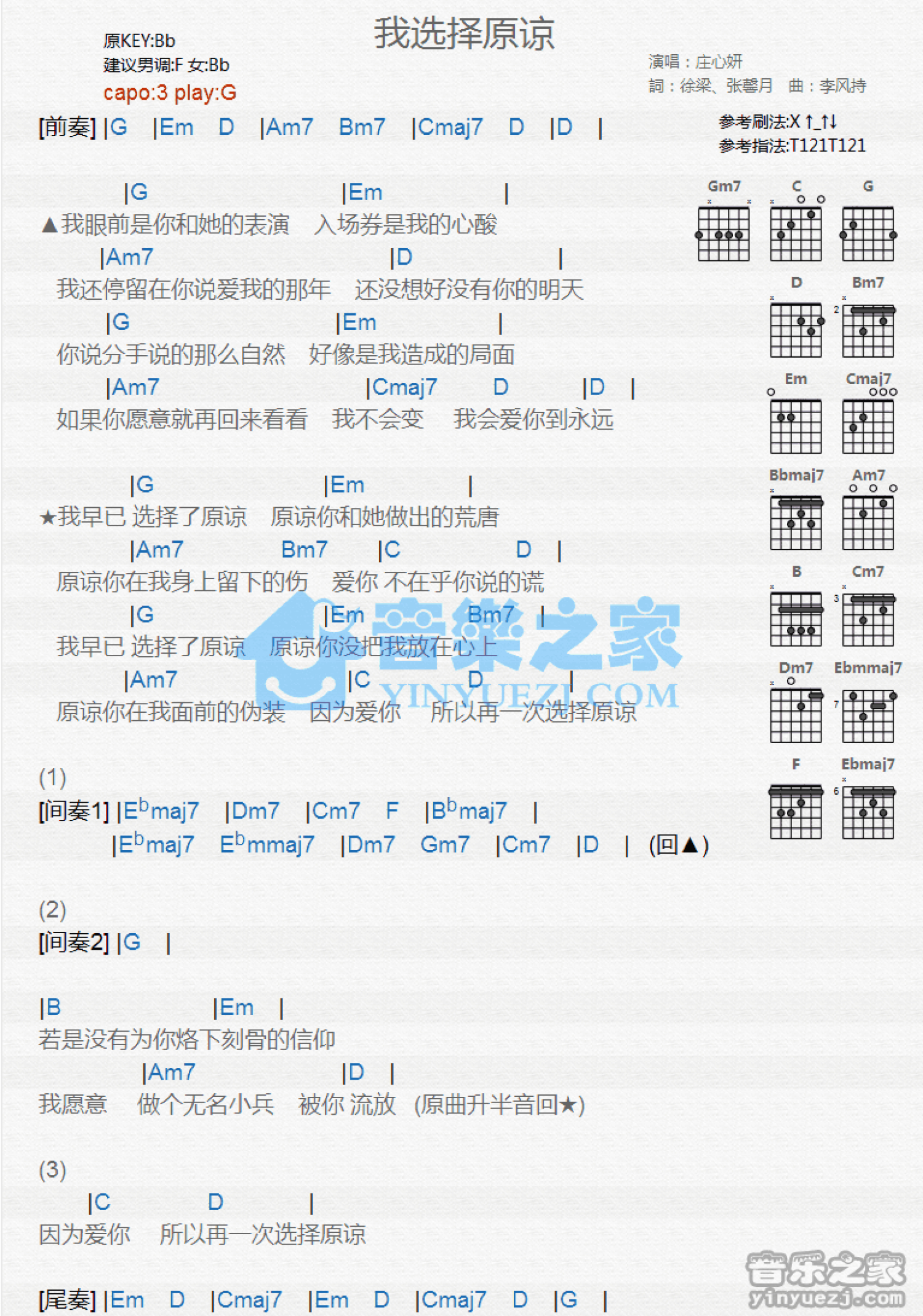 曲谱介绍: G调版庄心妍《我选择原谅》吉他和弦弹唱谱