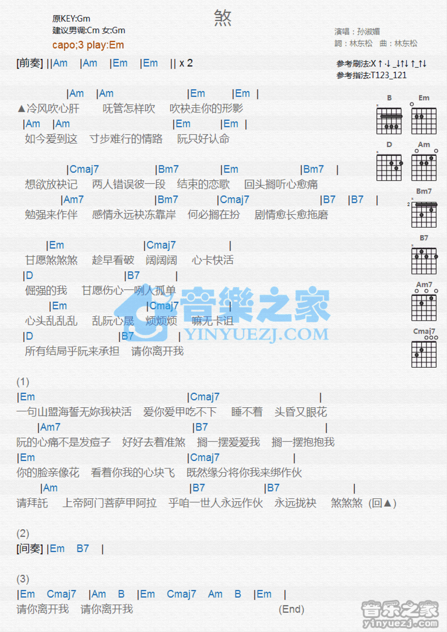 曲谱介绍: Em调版孙淑媚《煞》吉他和弦弹唱谱