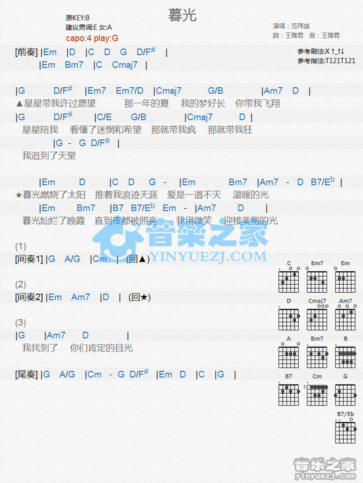 曲谱介绍: G调版范玮琪《暮光》吉他和弦弹唱谱