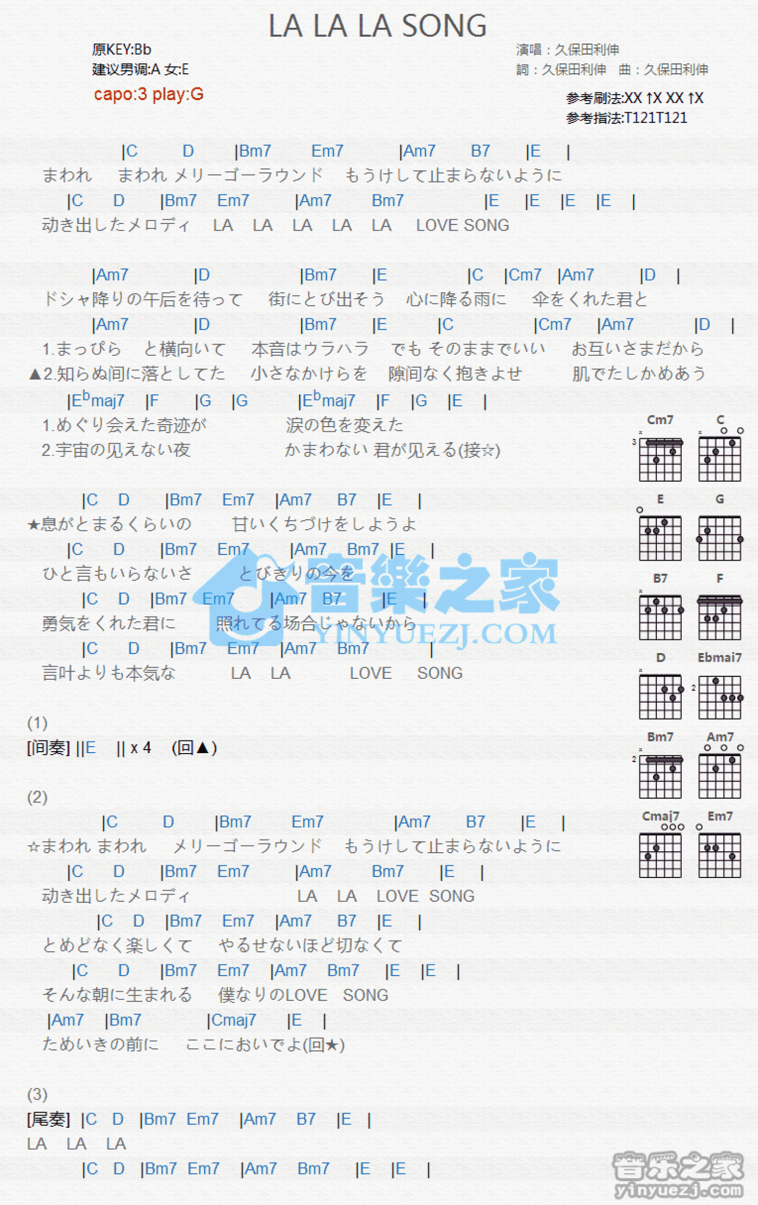 曲谱介绍: G调版久保田利伸《LALALASONG》吉他和弦弹唱谱