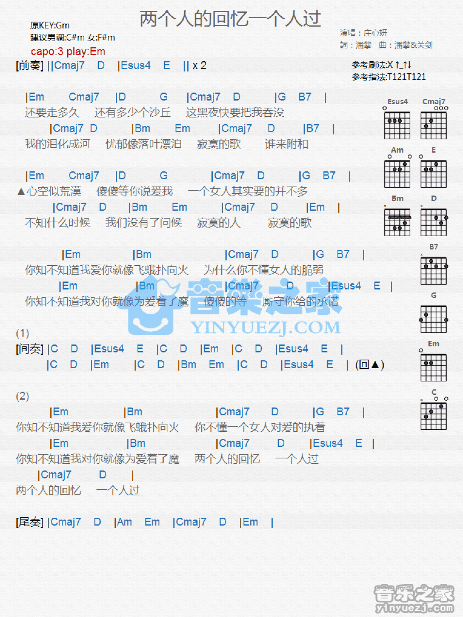 曲谱介绍: Em调版《两个人的回忆一个人过》吉他和弦弹唱谱