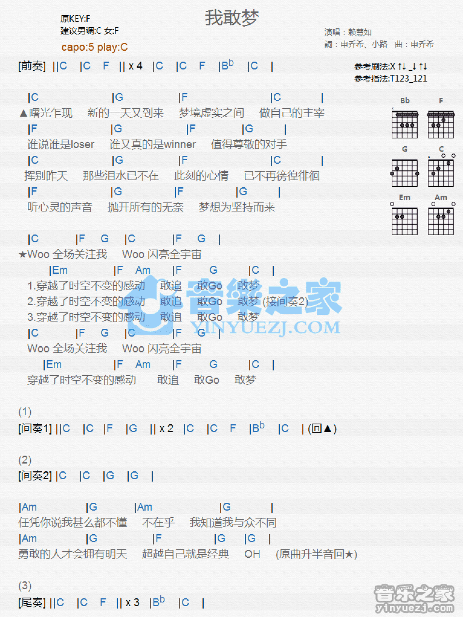 曲谱介绍: C调版赖慧如《我敢梦》吉他和弦弹唱谱