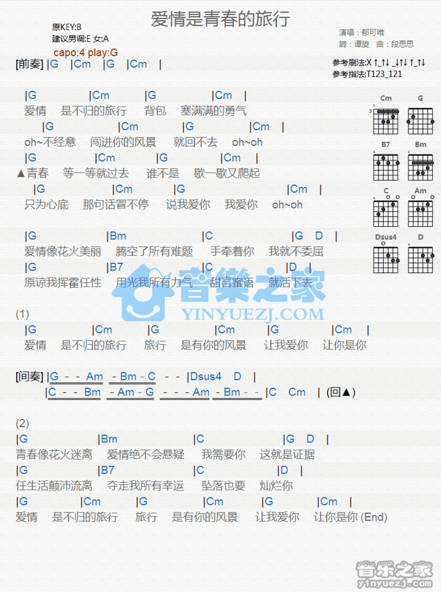 曲谱介绍: G调版郁可唯《爱情是青春的旅行》吉他和弦弹唱谱