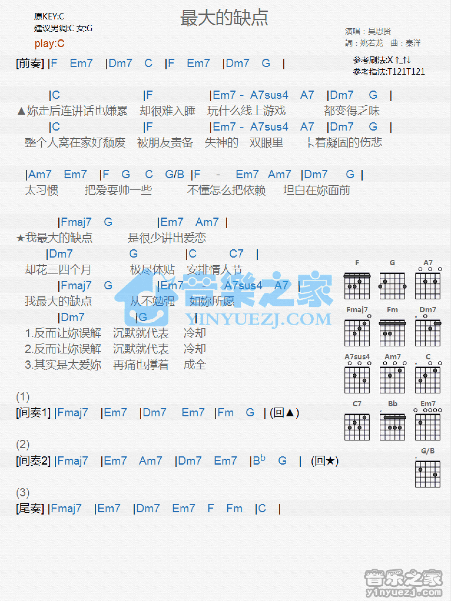 曲谱介绍: C调版吴思贤《最大的缺点》吉他和弦弹唱谱