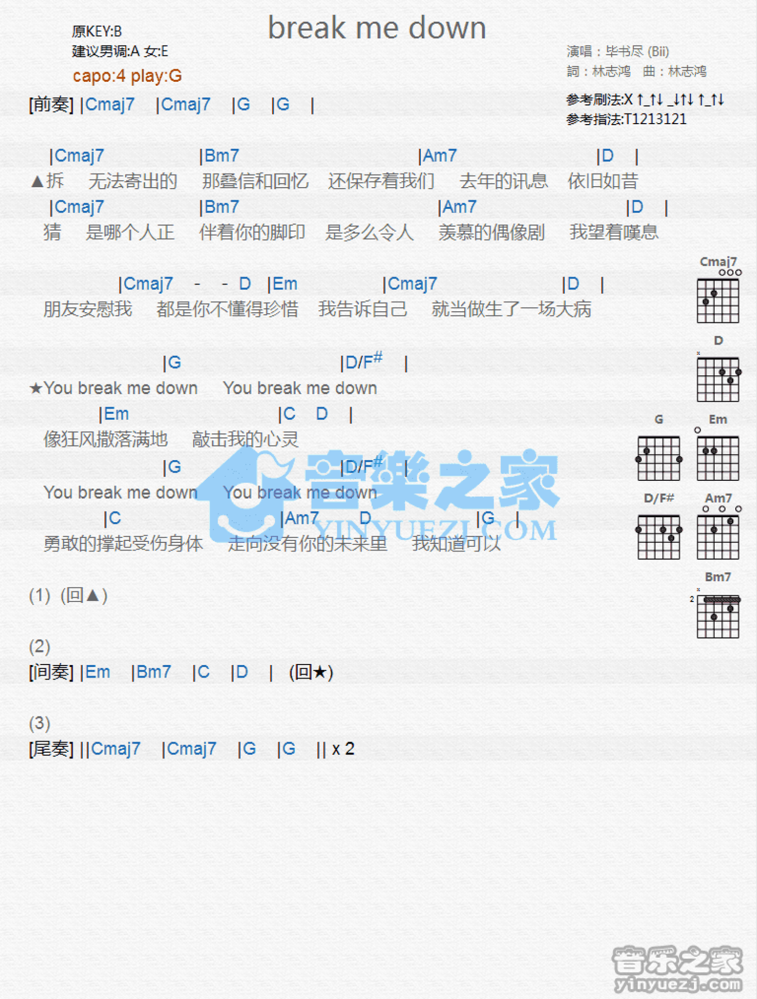 曲谱介绍: G调版毕书尽《BreakMeDown》吉他和弦弹唱谱