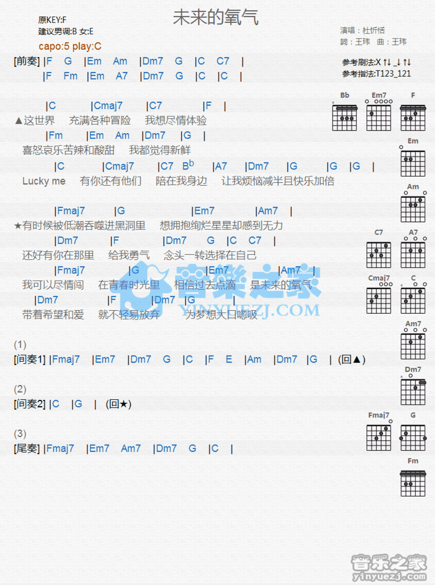 曲谱介绍: C调版《未来的氧气》吉他和弦弹唱谱