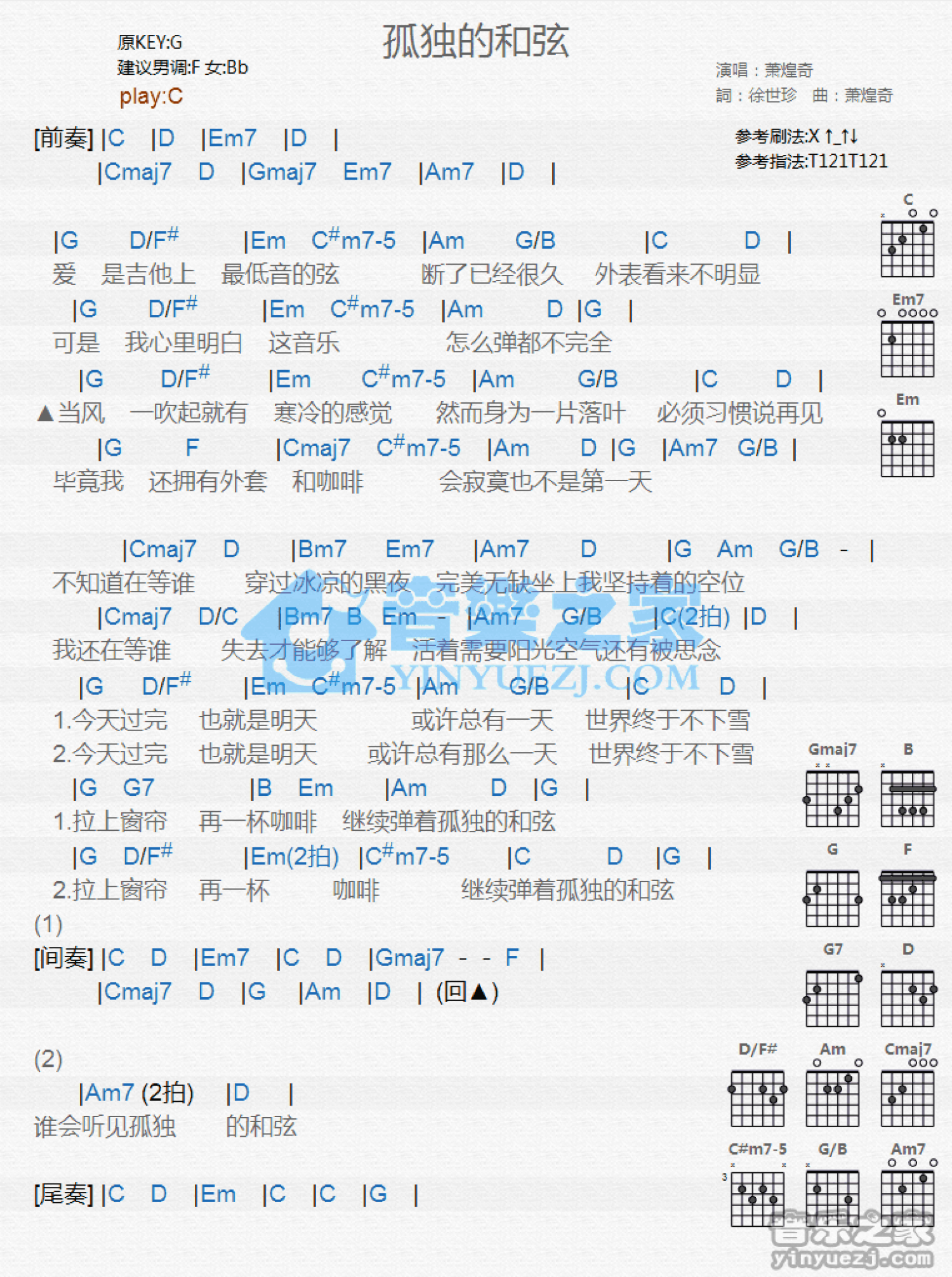 曲谱介绍: C调版萧煌奇《孤独的和弦》吉他和弦弹唱谱