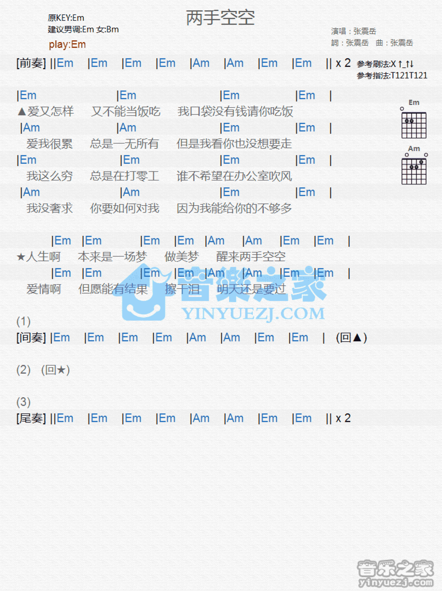 曲谱介绍: Em调版张震岳《两手空空》吉他和弦弹唱谱