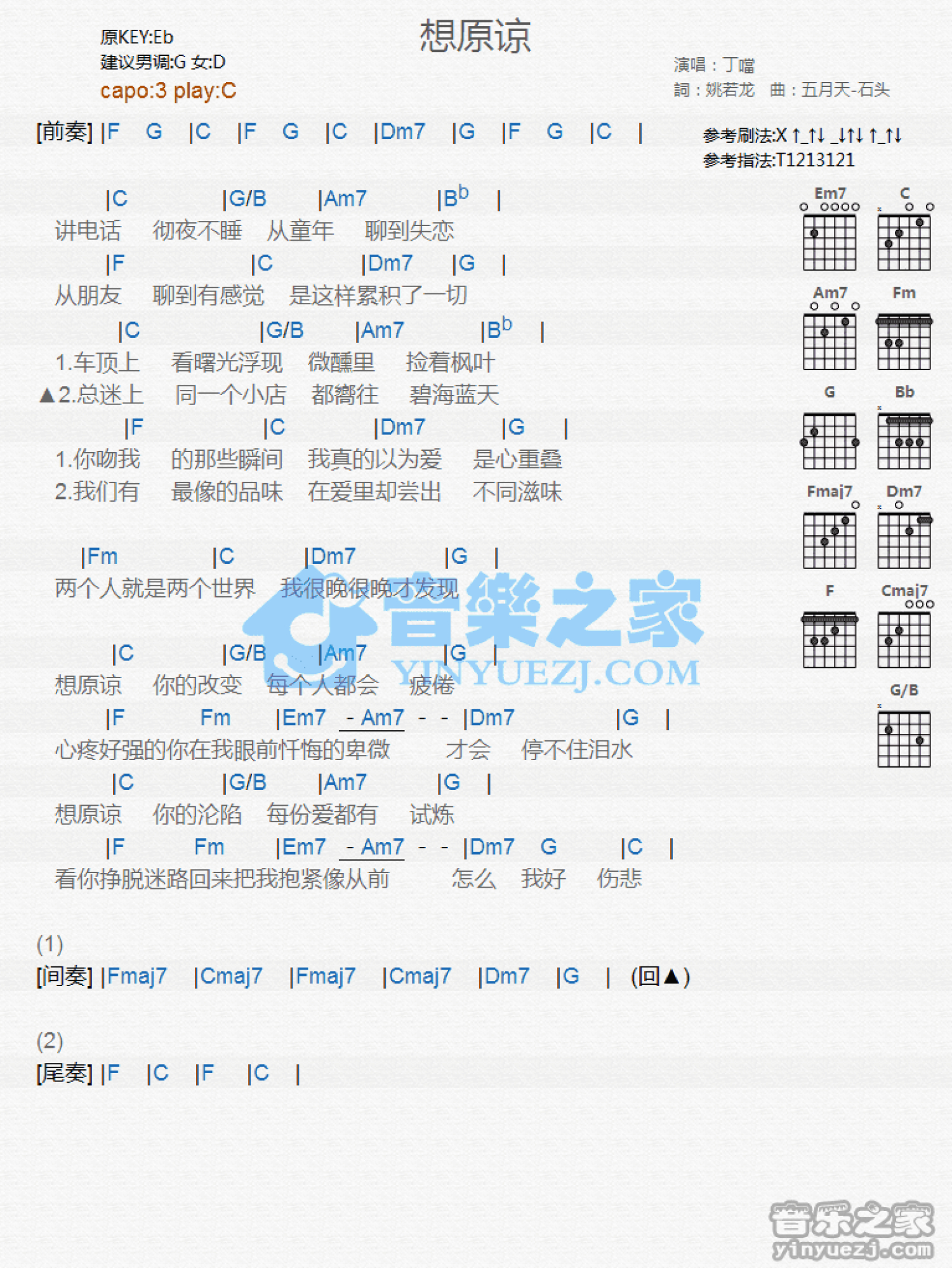 曲谱介绍: C调版丁当《想原谅》吉他和弦弹唱谱