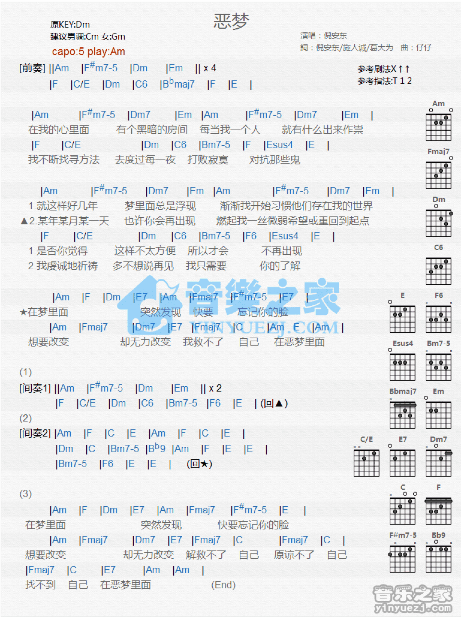 曲谱介绍: Am调版倪安东《噩梦》吉他和弦弹唱谱