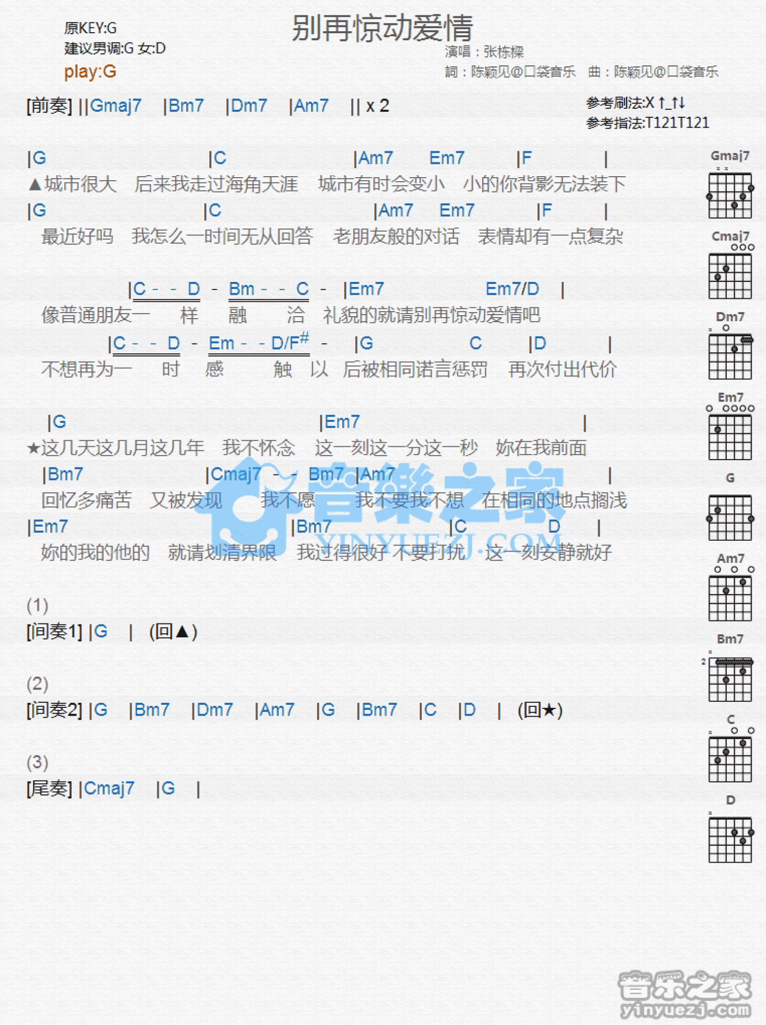 曲谱介绍: G调版张栋梁《别再惊动爱情》吉他和弦弹唱谱