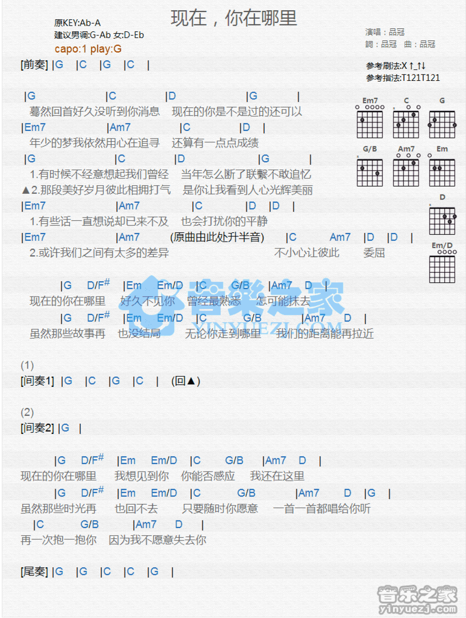 曲谱介绍: G调版品冠《现在你在哪里》吉他和弦弹唱谱