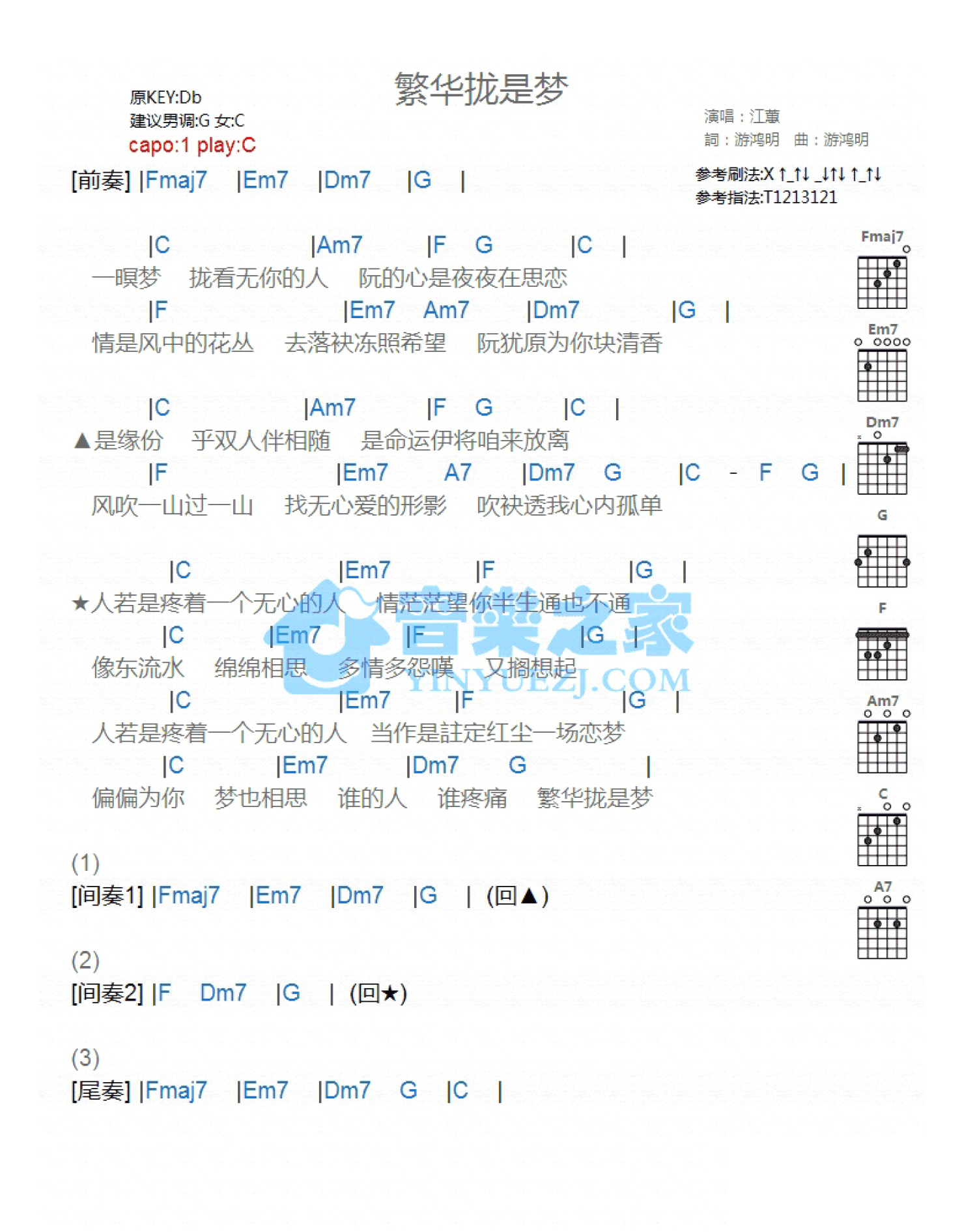 曲谱介绍: C调版江蕙《繁华拢是梦》吉他和弦弹唱谱