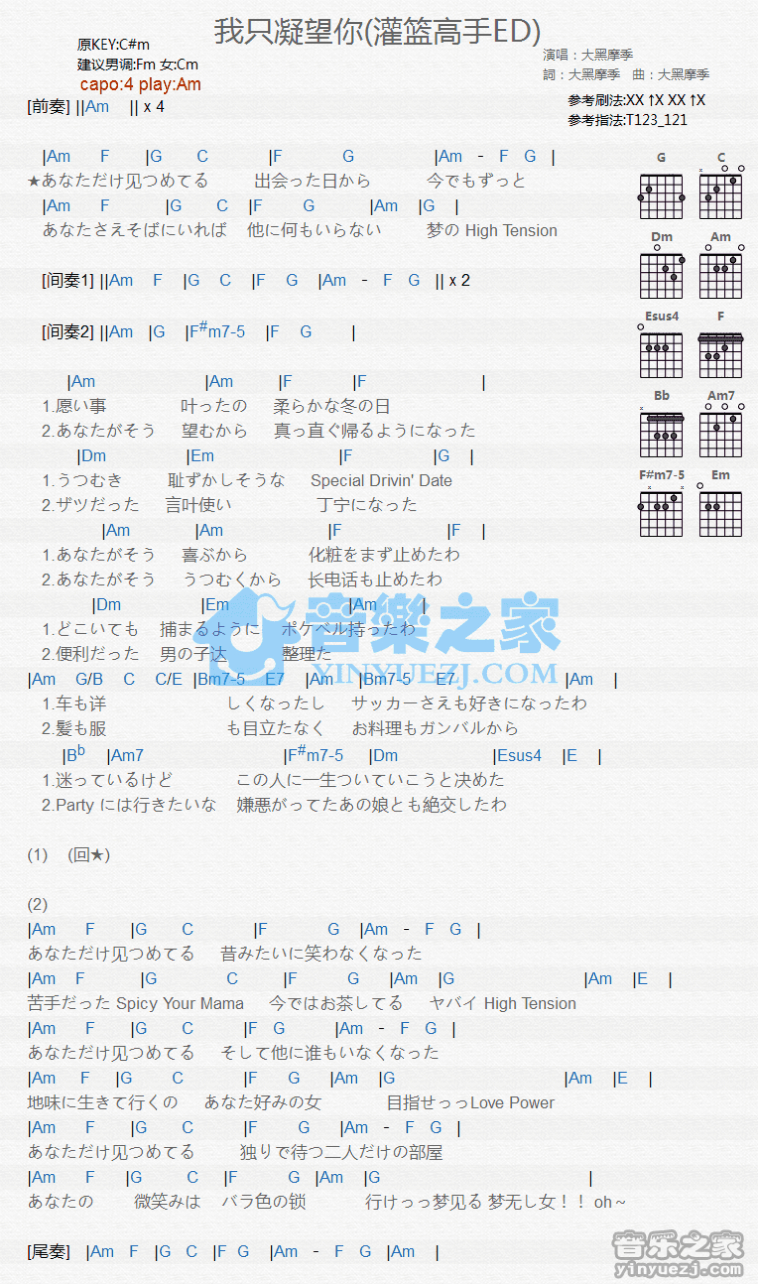 曲谱介绍: Am调版大黑摩季《我只凝望你》吉他和弦弹唱谱
