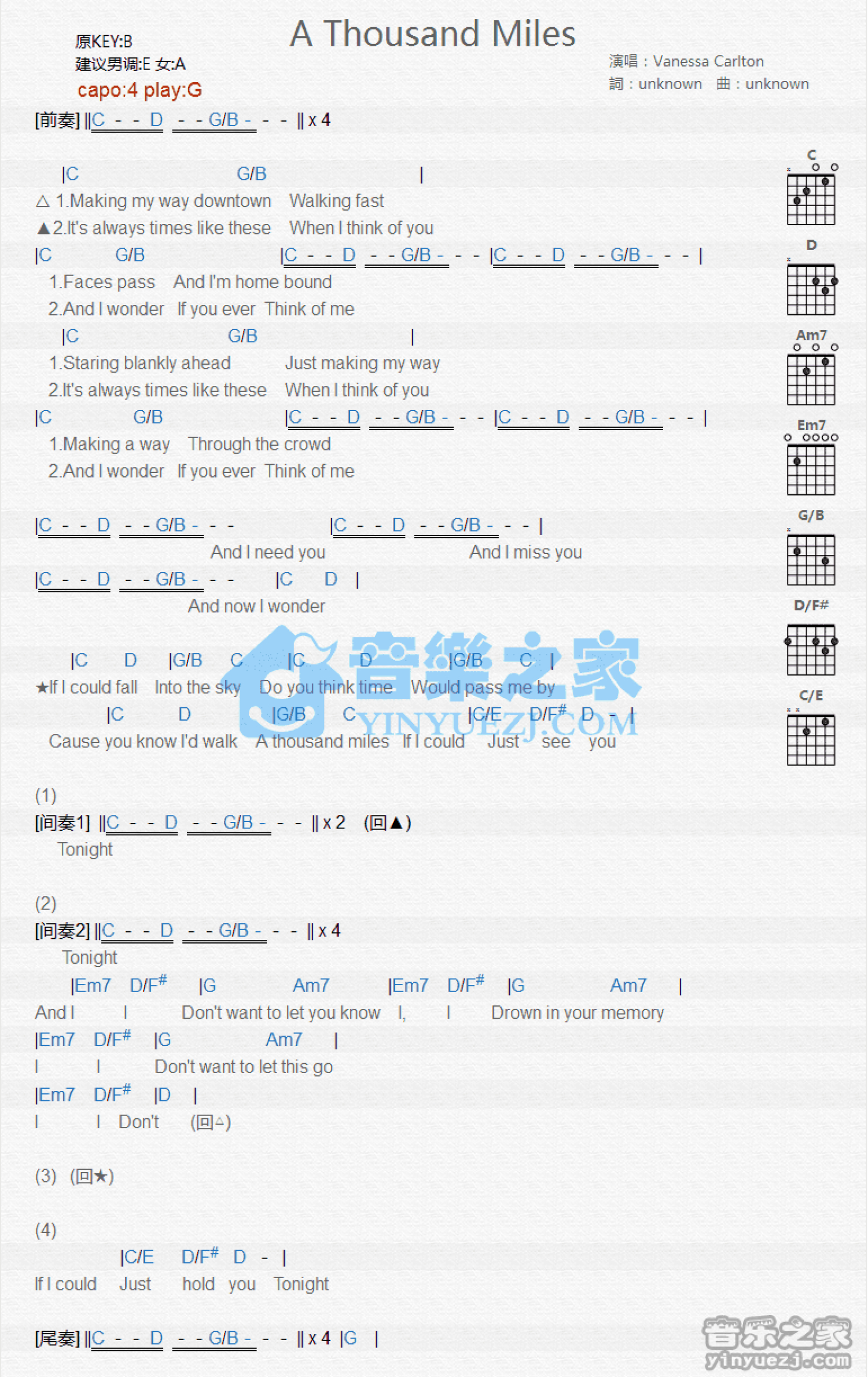 曲谱介绍: G调版VanessaCarlton《AThousandMiles》吉他和弦弹唱谱