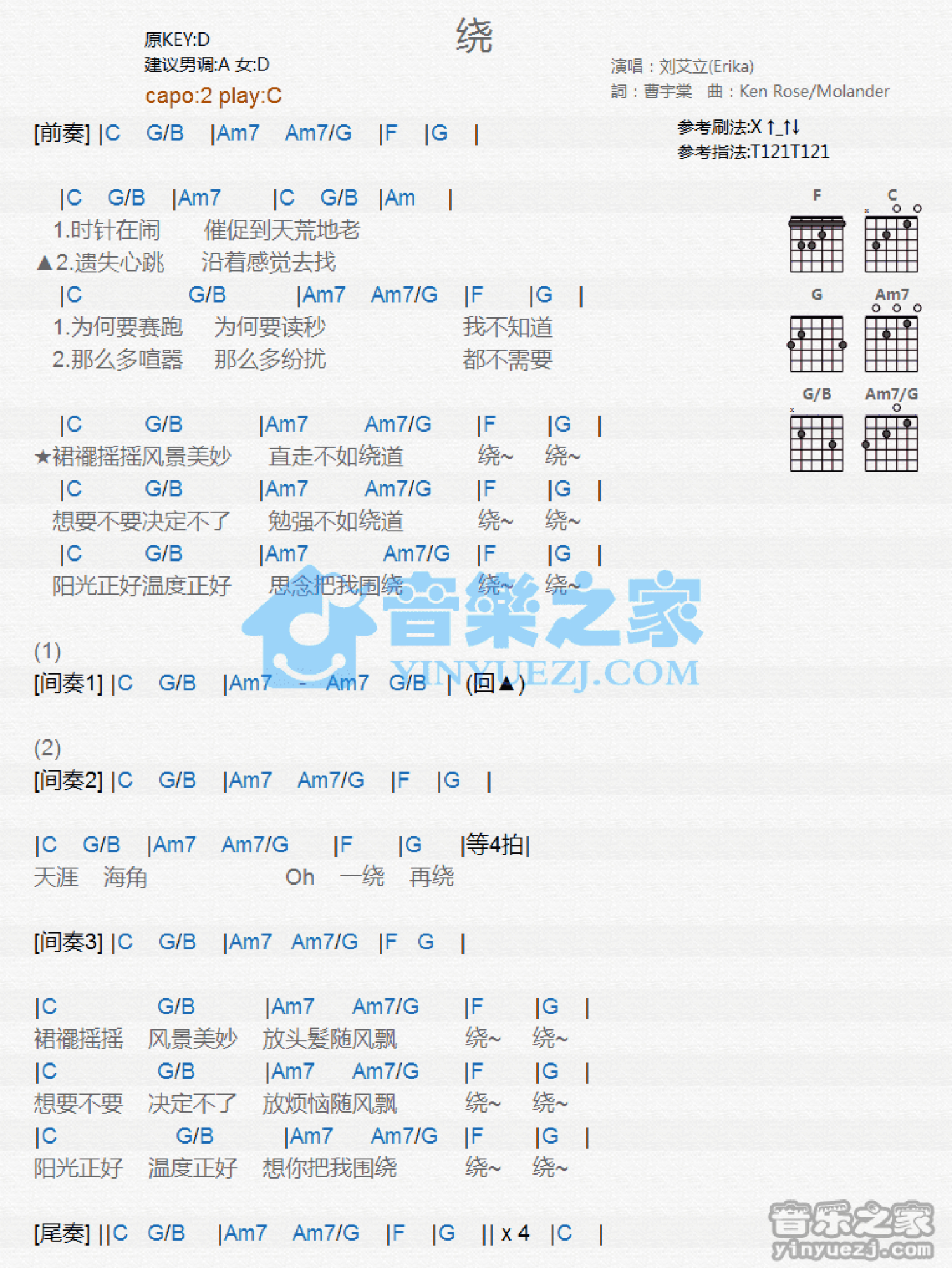 曲谱介绍: C调版刘艾立《绕》吉他和弦弹唱谱