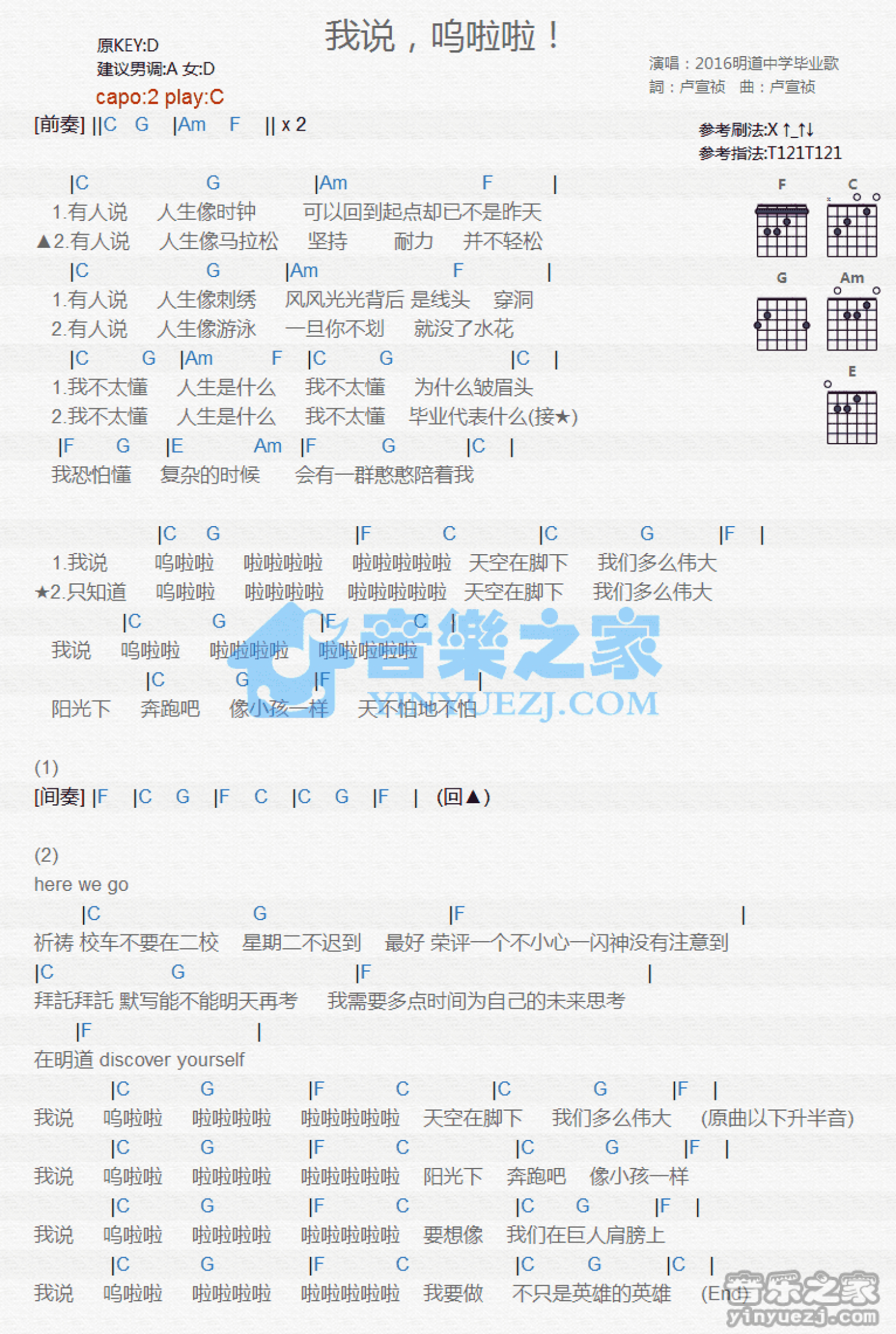 曲谱介绍: C调版2016明道中学毕业歌《我说呜啦啦》吉他和弦弹唱谱