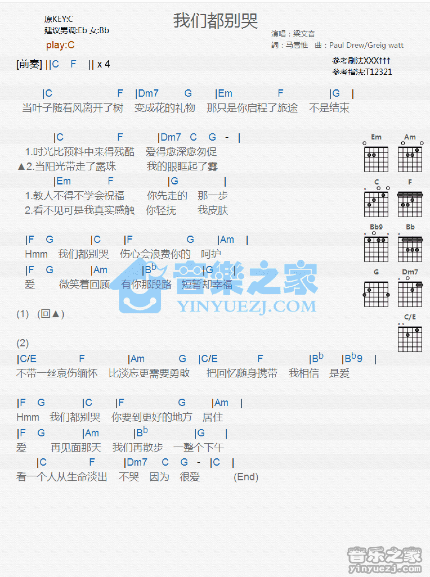 曲谱介绍: C调版梁文音《我们都别哭》吉他和弦弹唱谱