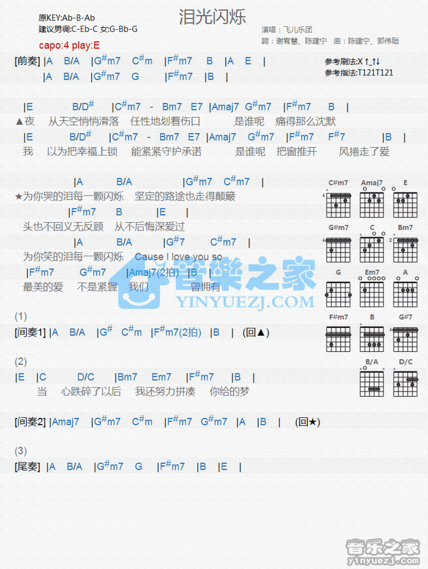 曲谱介绍: E调版飞儿乐团《月光闪烁》吉他和弦弹唱谱