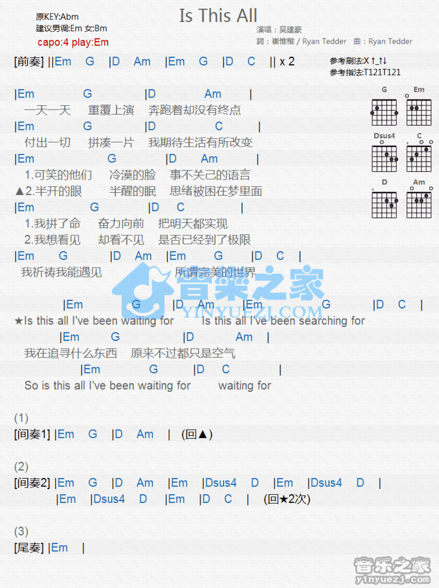 曲谱介绍: Em调版吴建豪《IsThisAll》吉他和弦弹唱谱