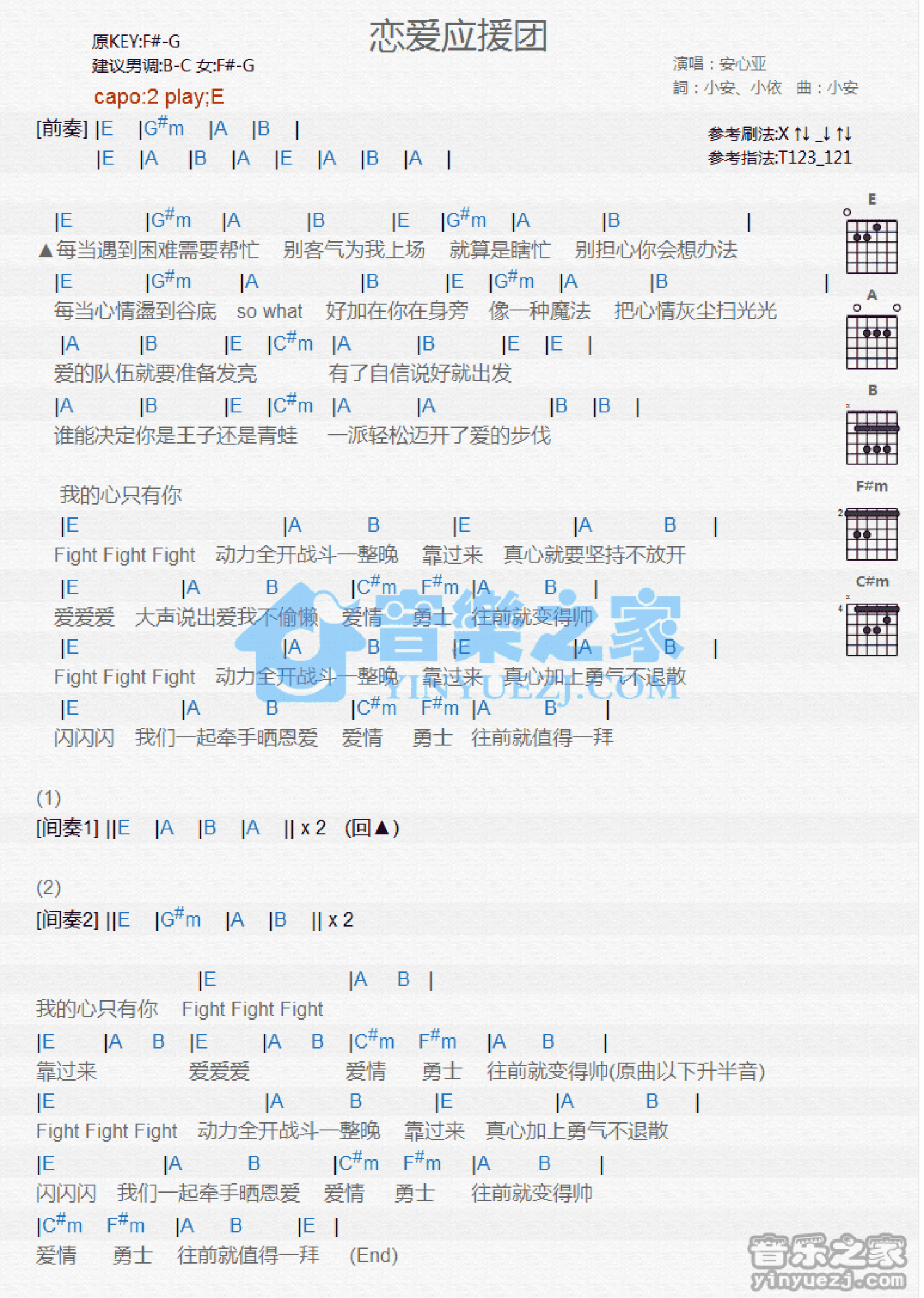 曲谱介绍: E调版安心亚《恋爱应援团》吉他和弦弹唱谱