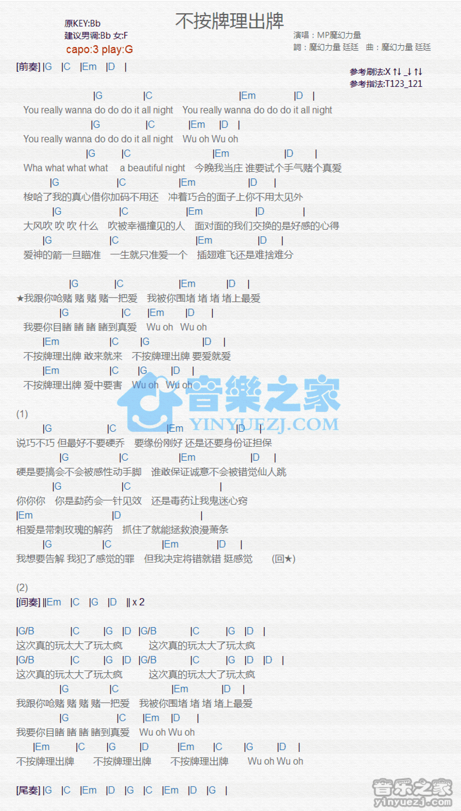 曲谱介绍: G调版MP《不按牌理出牌》吉他和弦弹唱谱