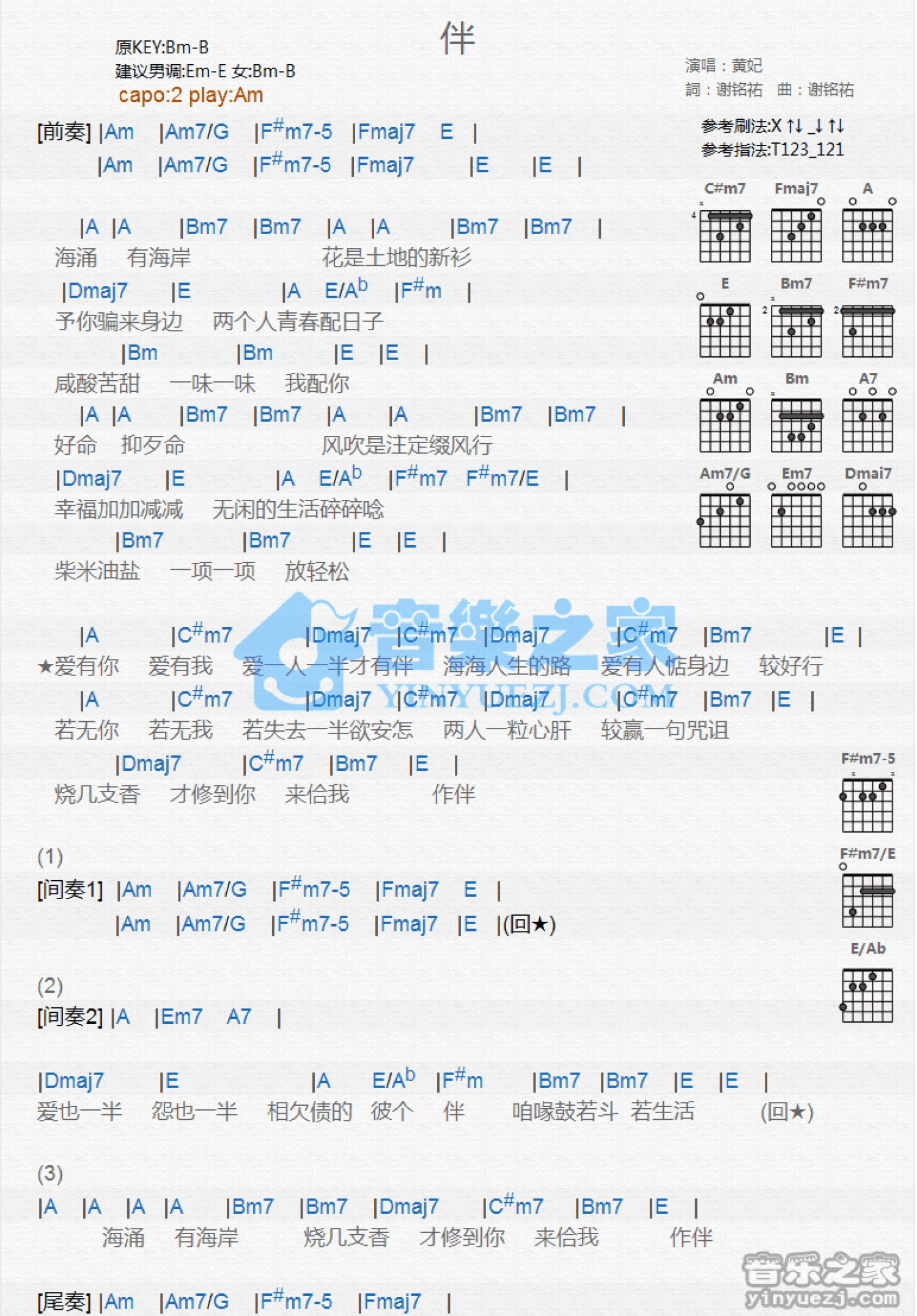 曲谱介绍: Am调版黄妃《伴》吉他和弦弹唱谱