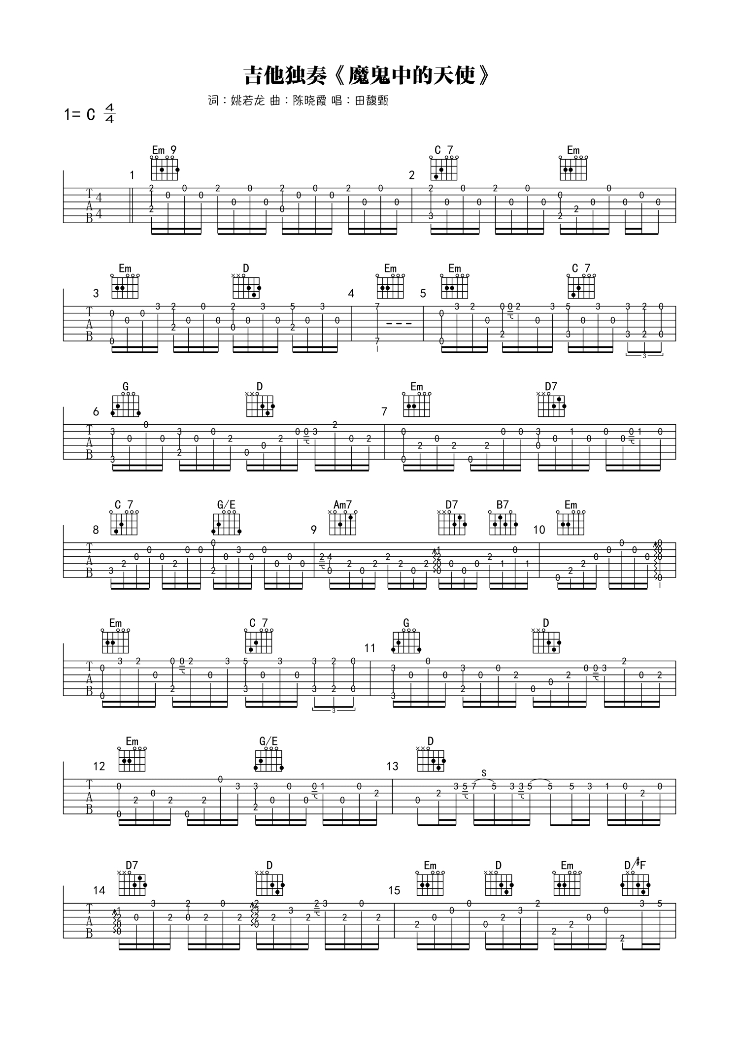 • 魔鬼中的天使吉他谱 - 田馥甄 - C调吉他独奏谱第1张