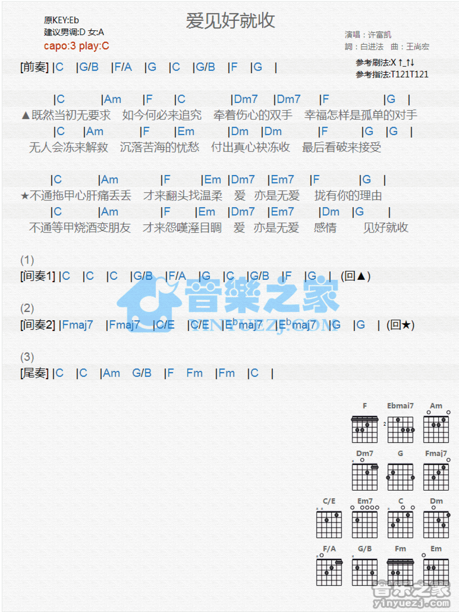 曲谱介绍: C调版许富凯《爱见好就收》吉他和弦弹唱谱