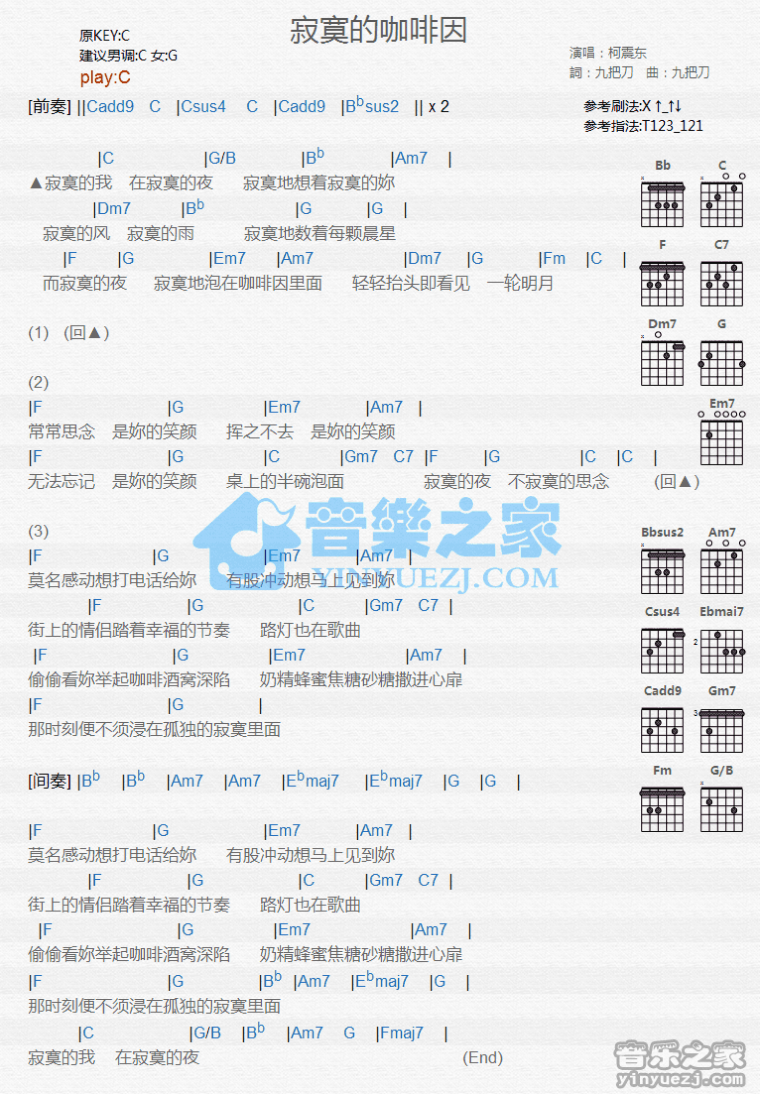曲谱介绍: C调版柯震东《寂寞的咖啡因》吉他和弦弹唱谱