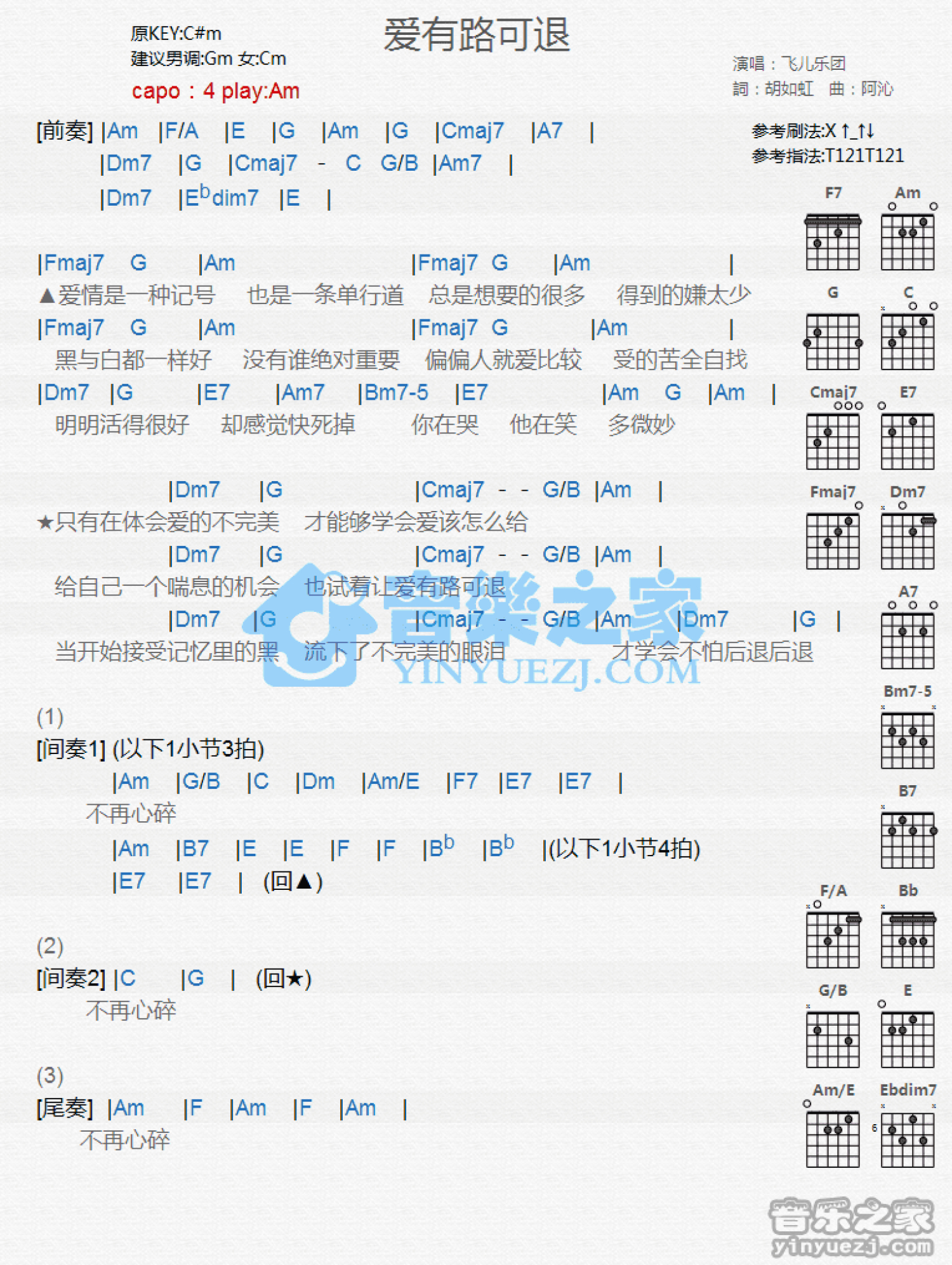 曲谱介绍: Am调版《爱有路可退》吉他和弦弹唱谱