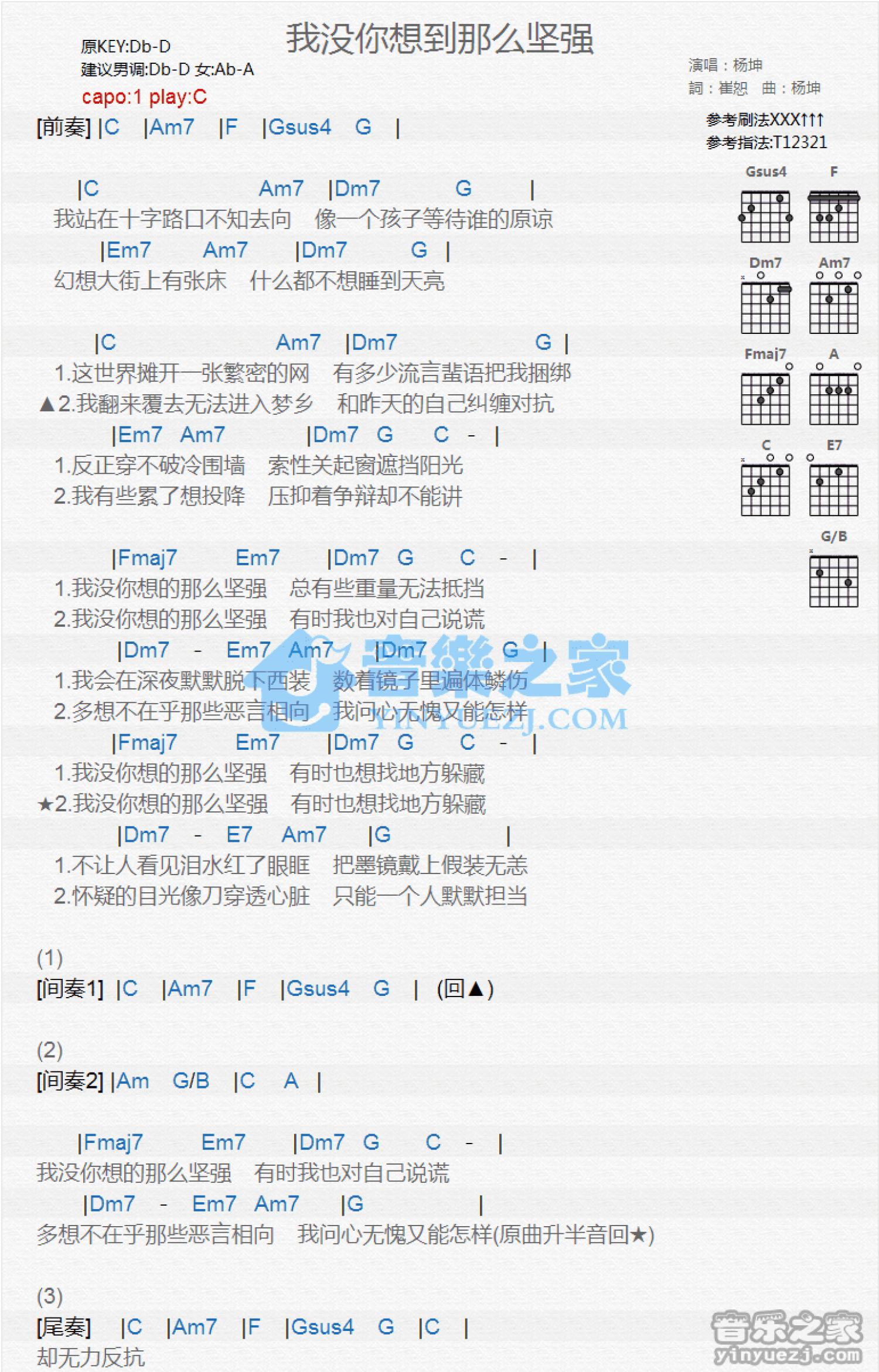 曲谱介绍: C调版杨坤《我没你想的那么坚强》吉他和弦弹唱谱