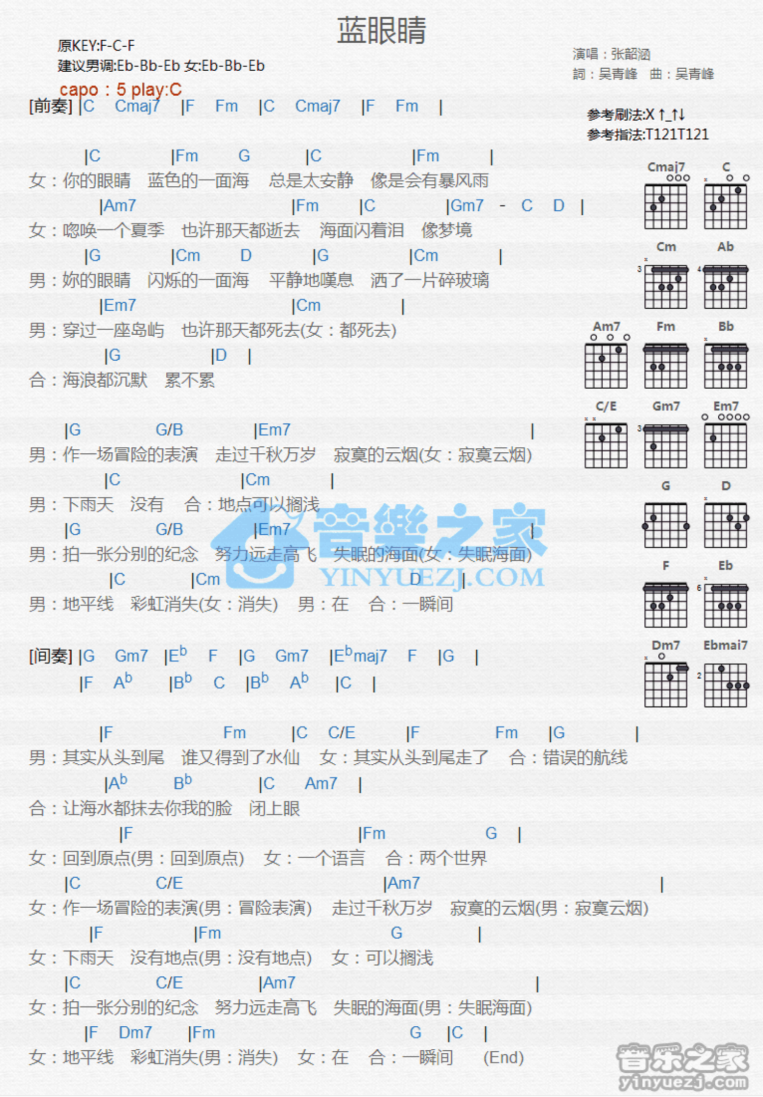 曲谱介绍: C调版张韶涵《蓝眼睛》吉他和弦弹唱谱