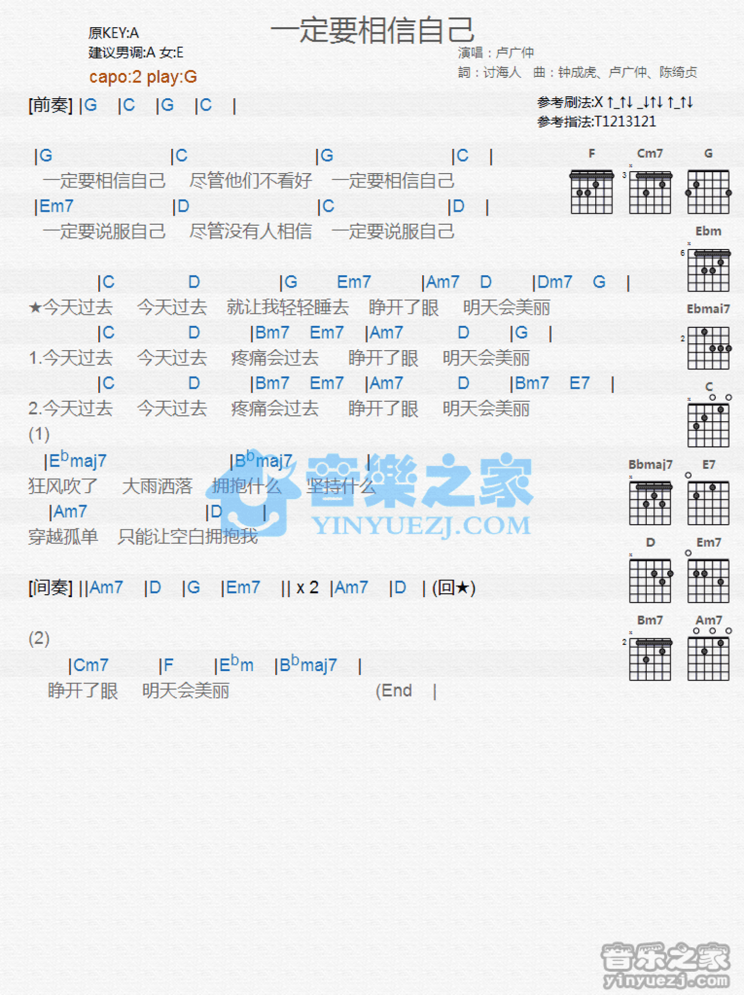 曲谱介绍: G调版《一定要相信自己》吉他和弦弹唱谱
