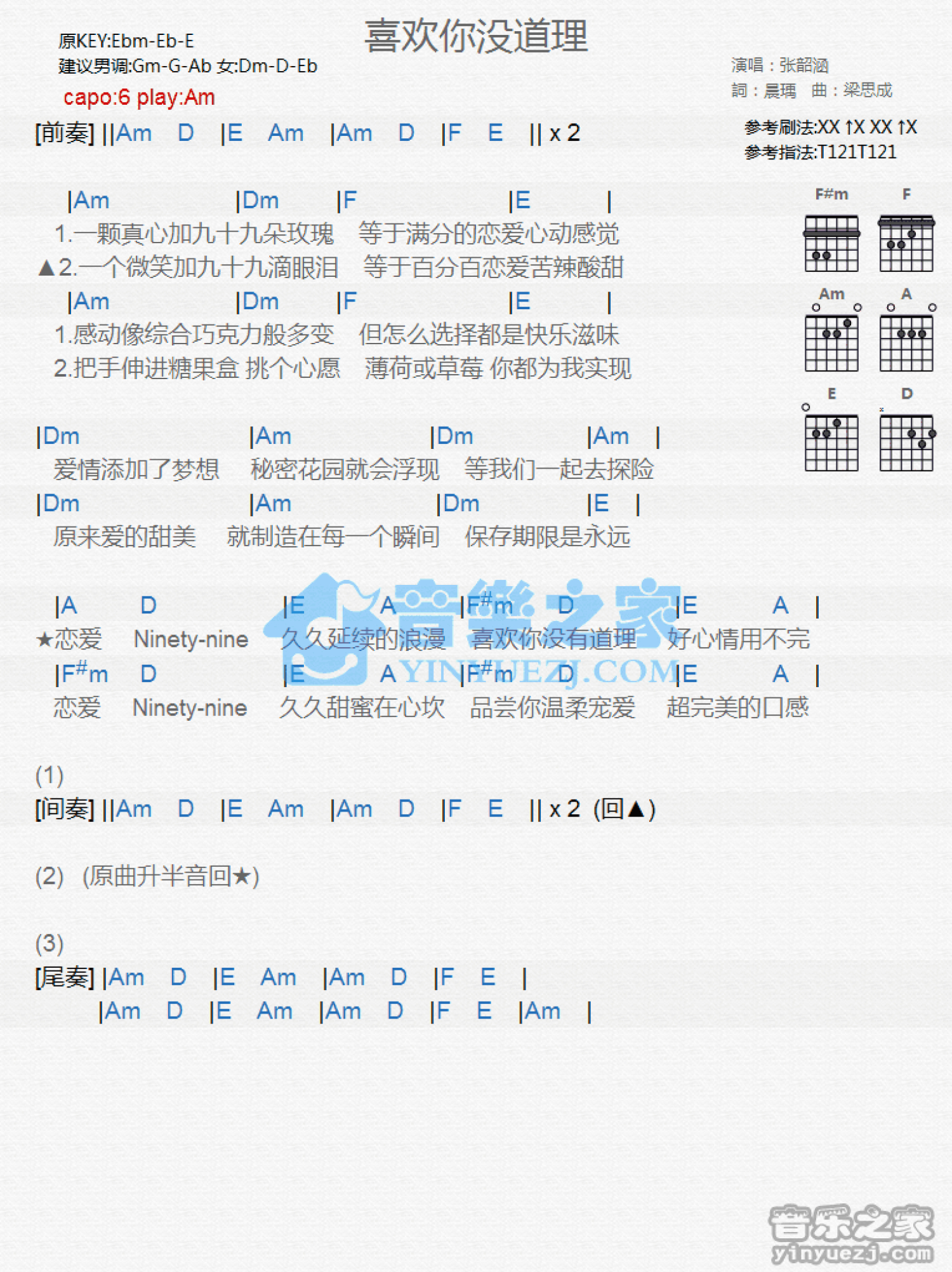 曲谱介绍: Am调版张韶涵《喜欢你没有道理》吉他和弦弹唱谱