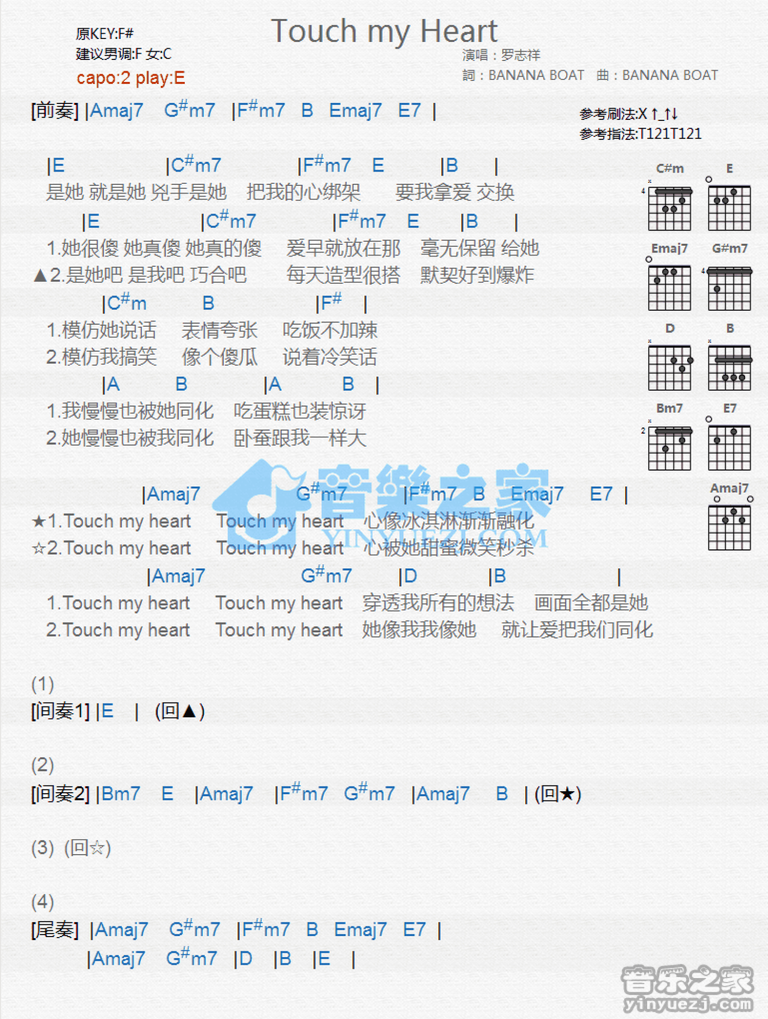 曲谱介绍: E调版罗志祥《TouchMyHeart》吉他和弦弹唱谱